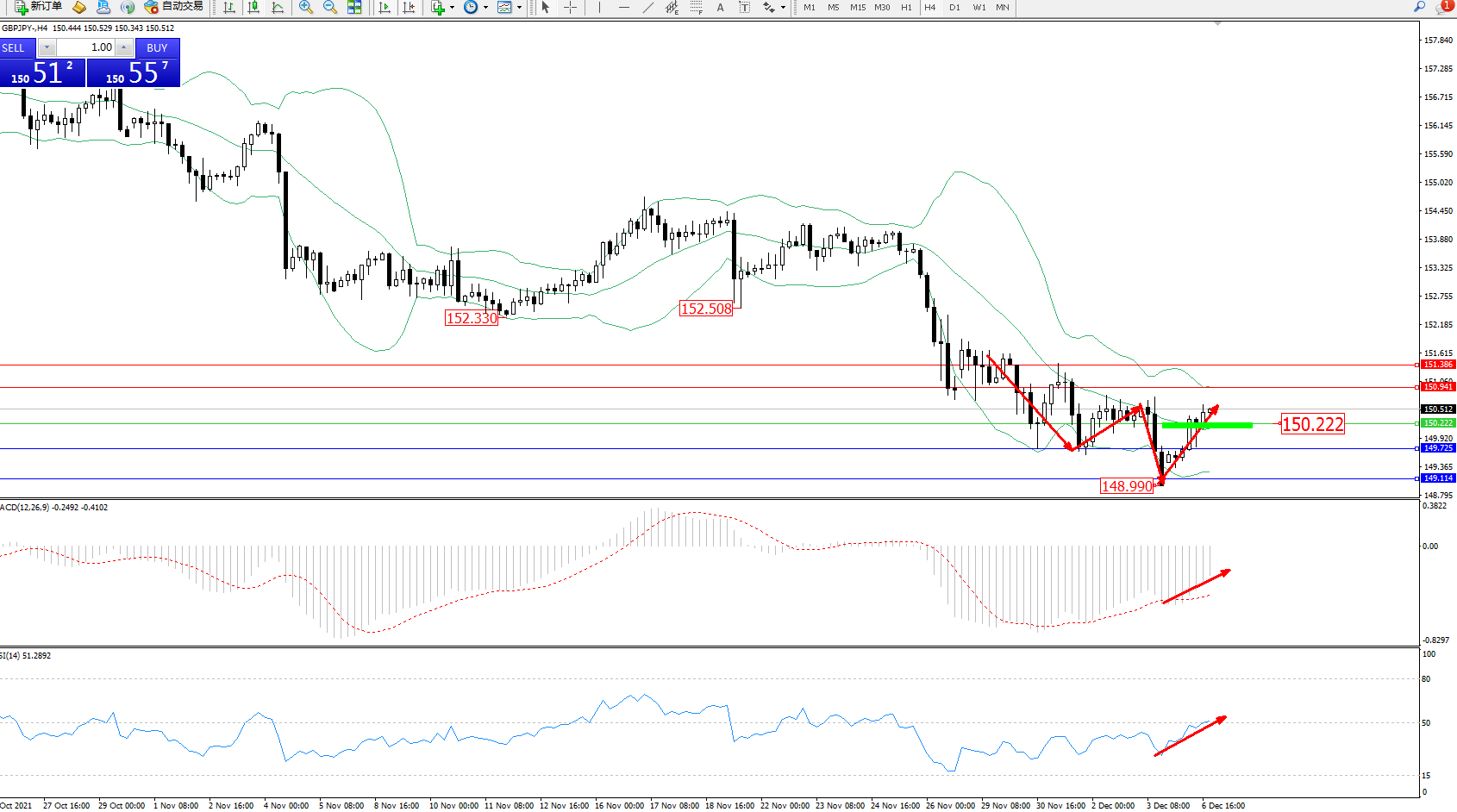 技术点评:空头动力延续布林带指标通道中下轨区间持续震荡下行,低位抵达148.990附近节点后开始震荡回升,突破布林带指标中轨进入中上轨区间震荡后有继续向上移动态势,布林带指标通道呈下行趋势走势后低位有收口平移迹象,多头动力开始有缓慢入场态势,MACD指标处于空头区域低位震荡缓慢上移,RSI指标处于空头区域维持震荡上移至50均衡线附近徘徊中;
