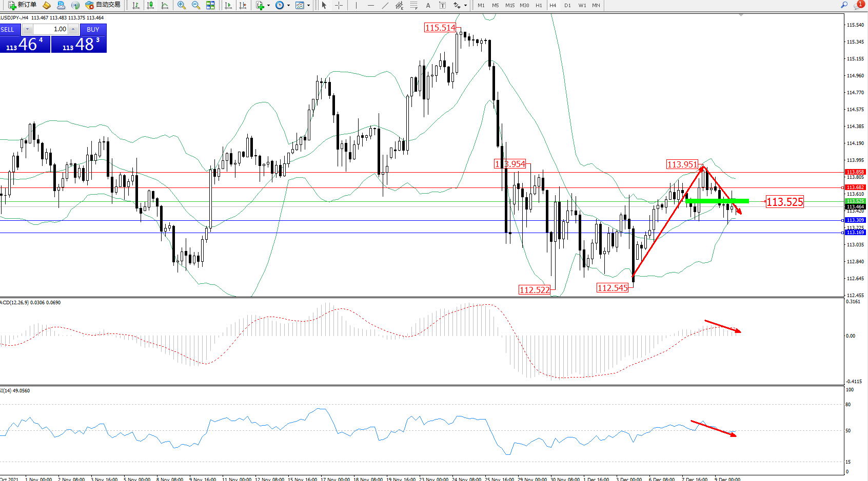 技术点评:低位多头动力维持在布林带指标通道中上轨区间持续震荡上扬,高位抵达113.951位置节点后遇阻回撤,纠结于布林布林带指标中下轨区间整理,布林带指标呈收口走势持续中,MACD指标处于多头区域维持整理缓慢下行,即将触及0轴线附近节点,RSI指标处于50均衡线附近弱势徘徊中;
