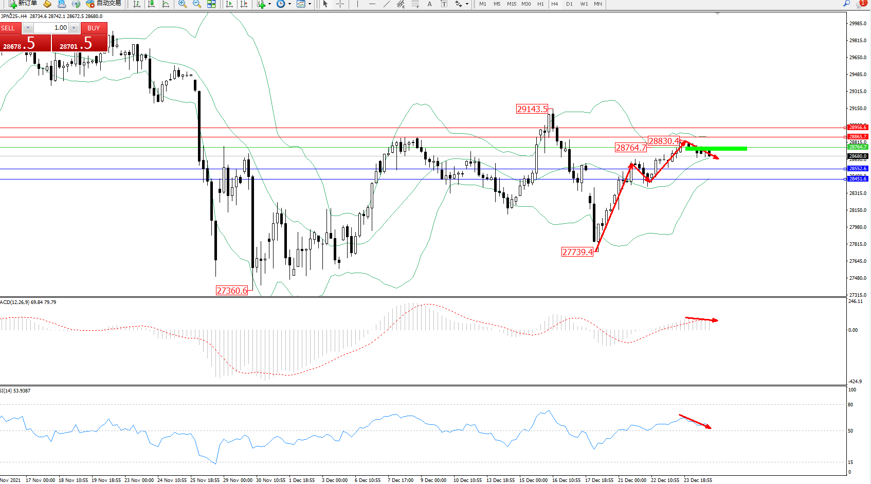 日经指数JPN225——4小时K线图显示: