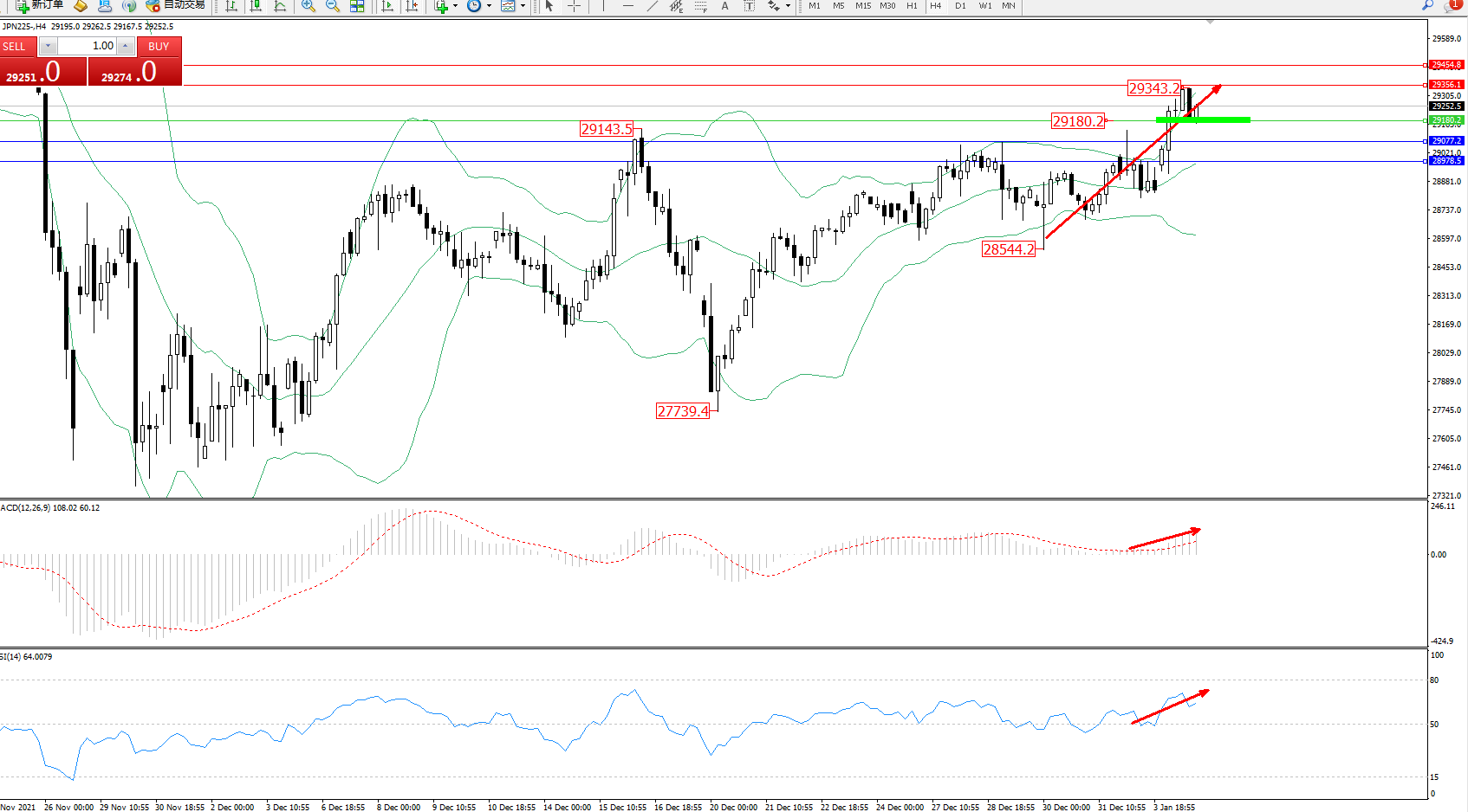 日经指数JPN225——4小时K线图显示: