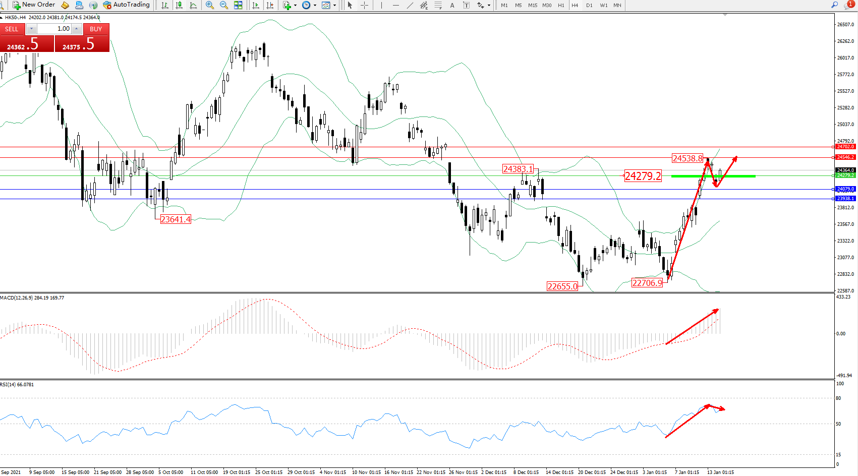 恒指HK50 ——4小时K线图显示: