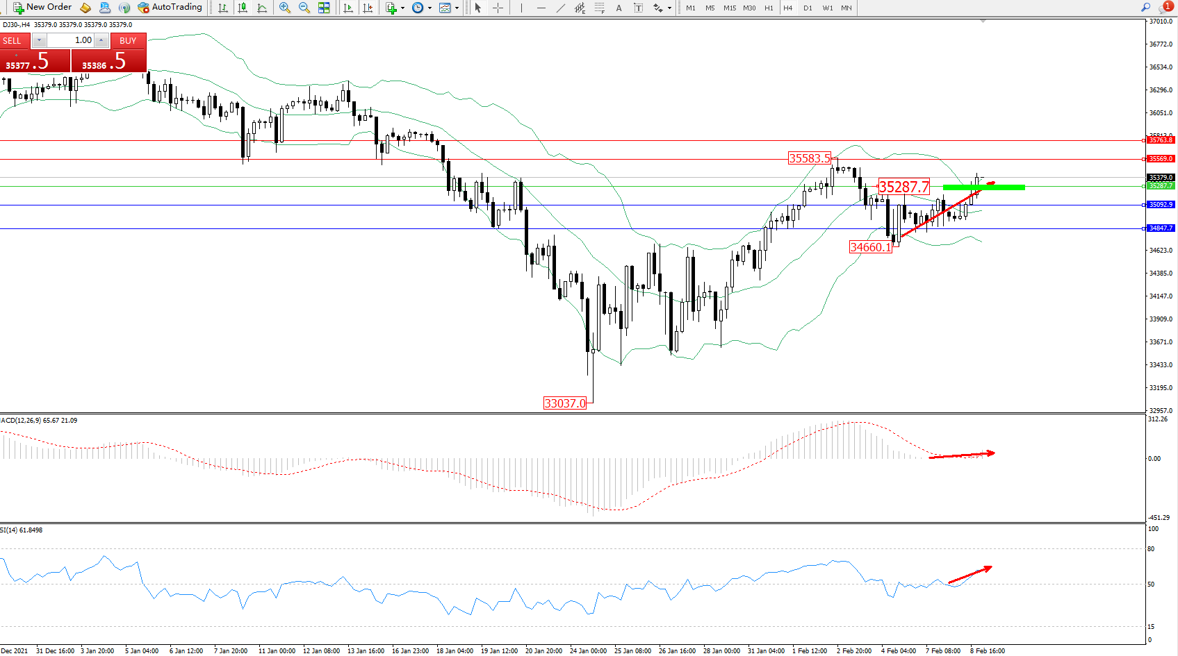 道琼斯指数DJ30——4小时K线图显示: