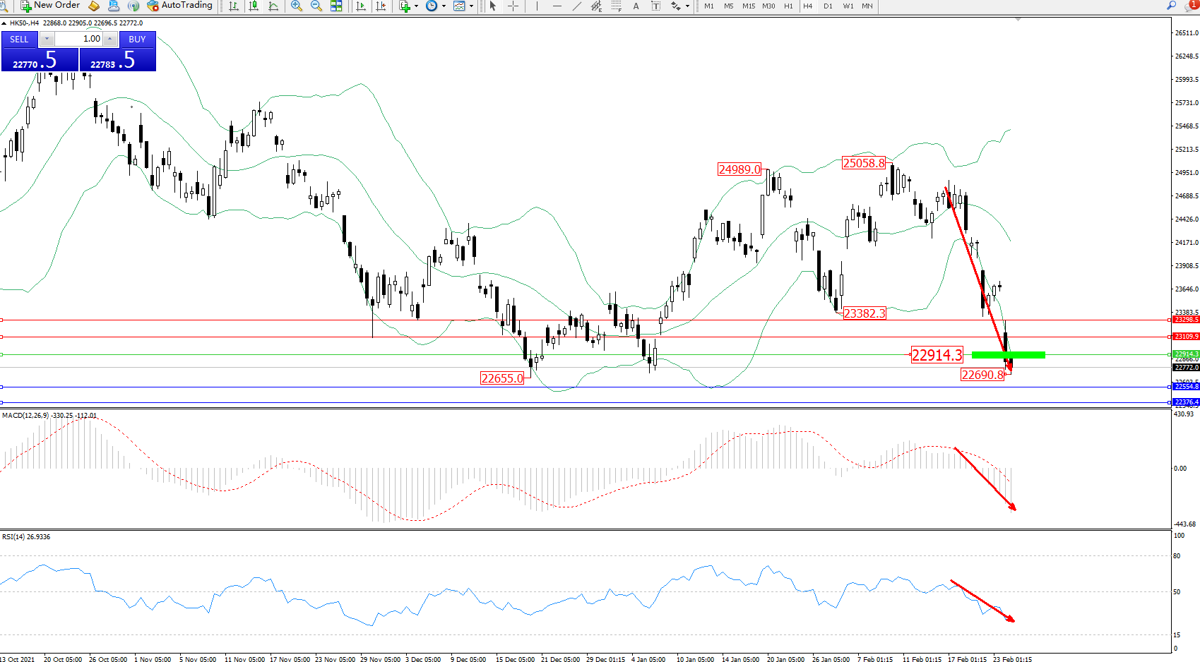 恒指HK50 ——4小时K线图显示: