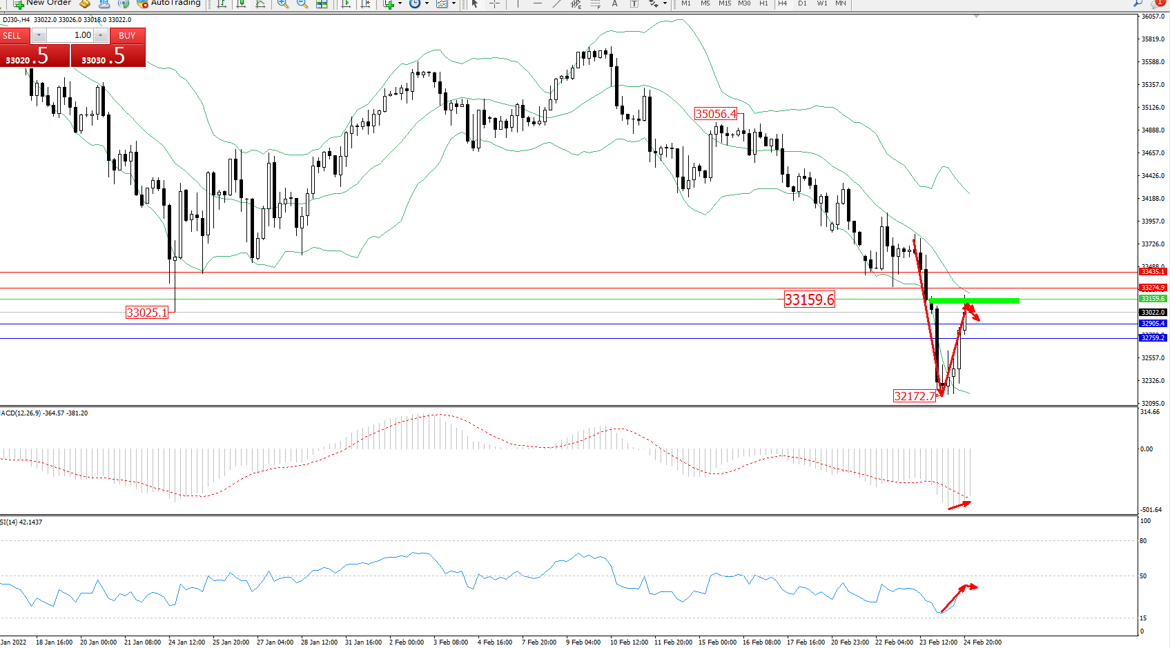 道琼斯指数DJ30——4小时K线图显示: