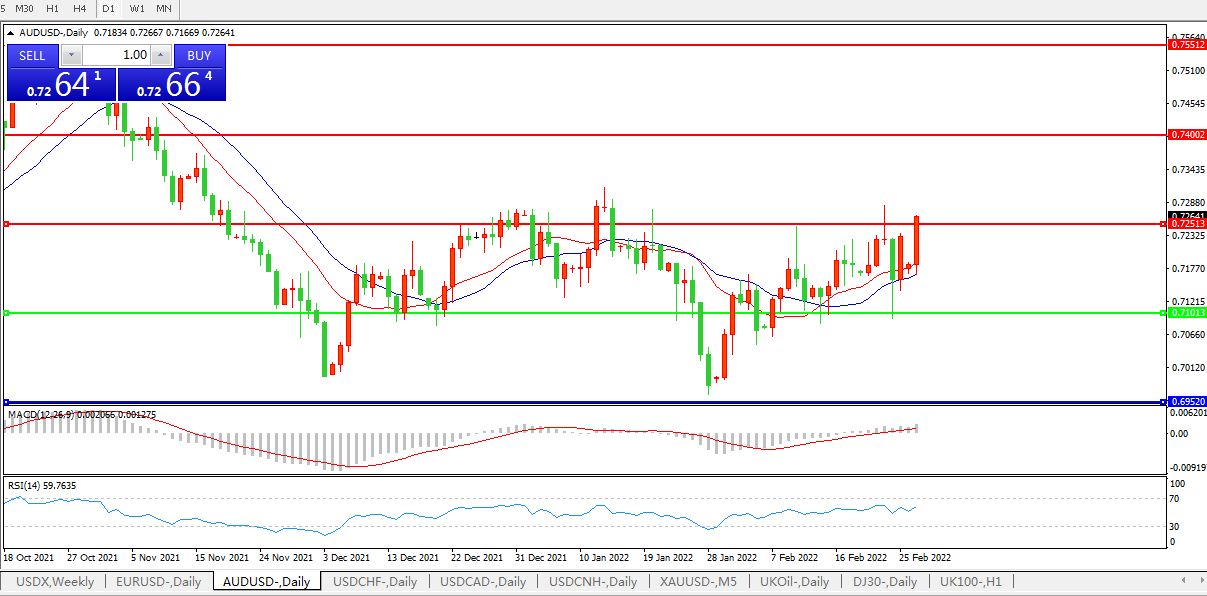 交易策略:0.7100上方看涨,目标0.7250、0.7400