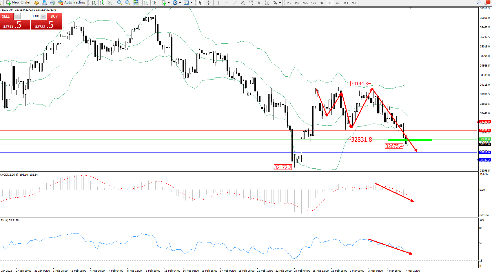 技术点评:短期处于布林带指标通道内维持宽幅震荡平移,空头动力伺机入场,延续布林带指标下轨附近节点不断震荡下行,抵达32675附近节点后开始整理,短期有继续向下移动态势,布林带指标呈张口走势持续中,MACD指标处于0轴线下方空头区域维持震荡下行,RSI指标处于50均衡线下侧不断弱势整理中;