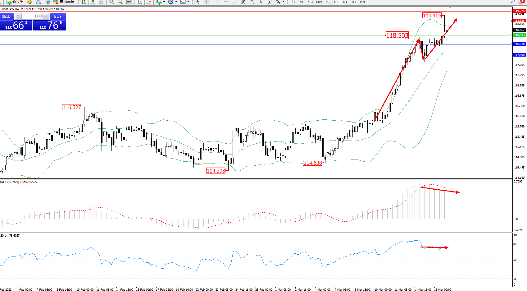 技术点评:多头动力延续布林带指标上轨附近持续震荡上扬,高位抵达119.106位置节点后开始震荡,短期多头拉升走势或将延续,维持高位窄幅震荡中,布林带指标呈上行趋势走势态势良好,MACD指标处于多头区域维持整理平移,RSI指标处于多头区域超买区80均衡线下侧弱势徘徊中;