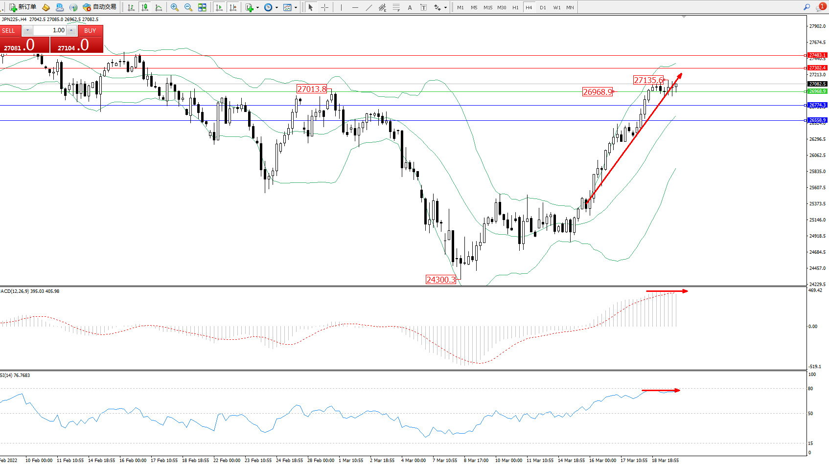 技术点评:多头动力延续布林带指标通道中上轨区间持续震荡上扬,高位抵达27135附近节点后整理,短期多头上行态势良好,布林带指标呈收口不断上移中,MACD指标处于多头区域高位维持整理平移,RSI指标处于多头区域维持超买区80均衡线下侧窄幅整理中;