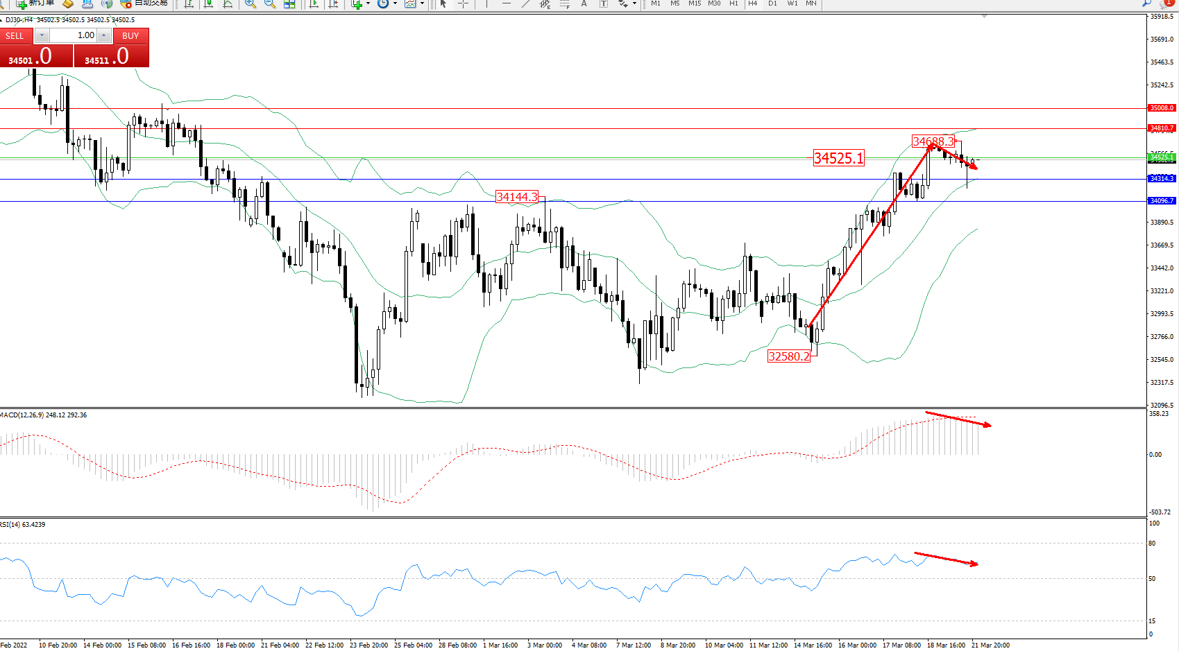 技术点评:多头动力延续布林带指标通道中上轨区间持续震荡上扬,高位抵达34688位置节点后遇阻整理,短期上行动力开始减弱,布林带指标呈上行趋势走势后开始缓慢收口平移,MACD指标处于多头区域维持整理平移,RSI指标处于多头区域维持弱势徘徊中;