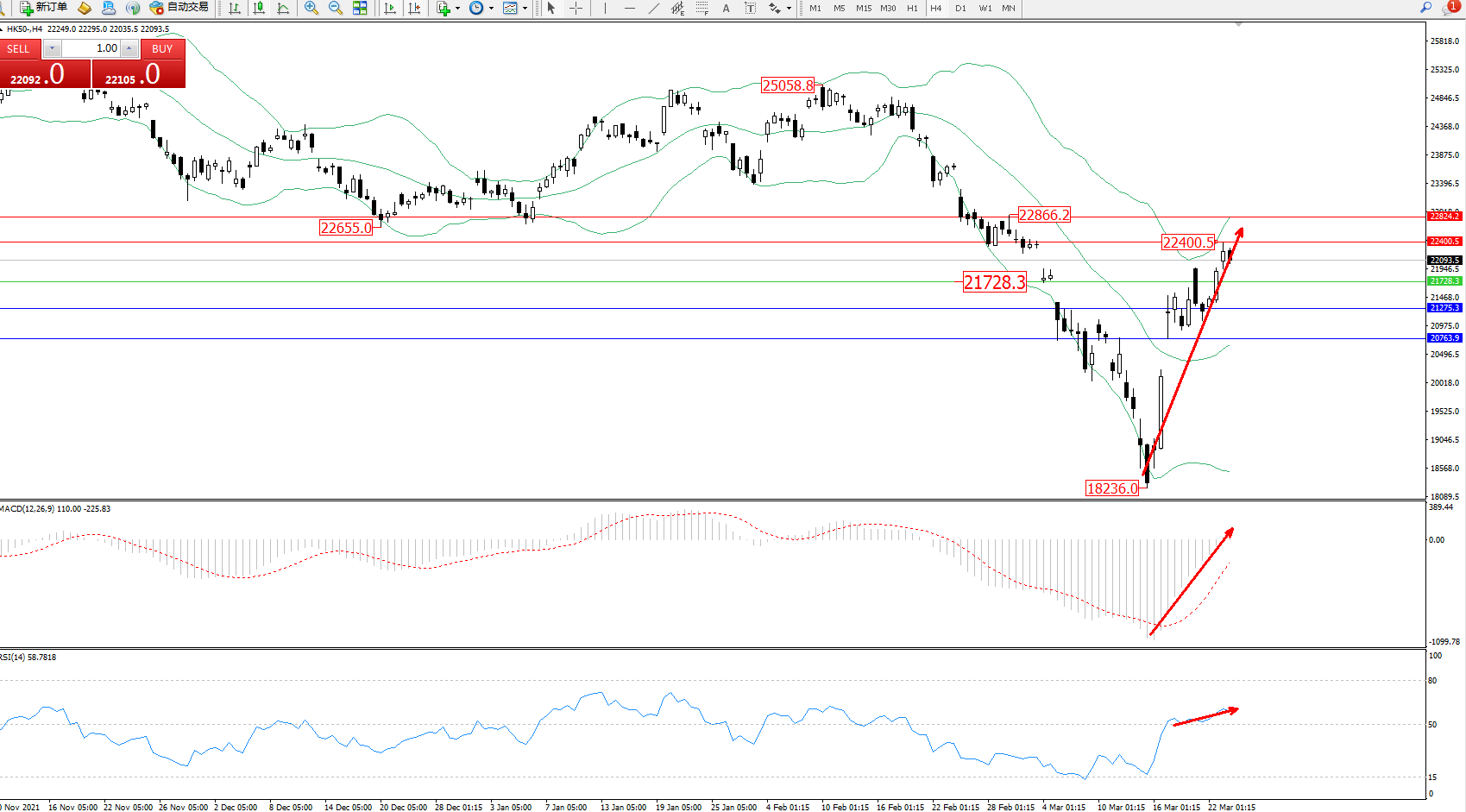 恒指HK50 ——4小时K线图显示: