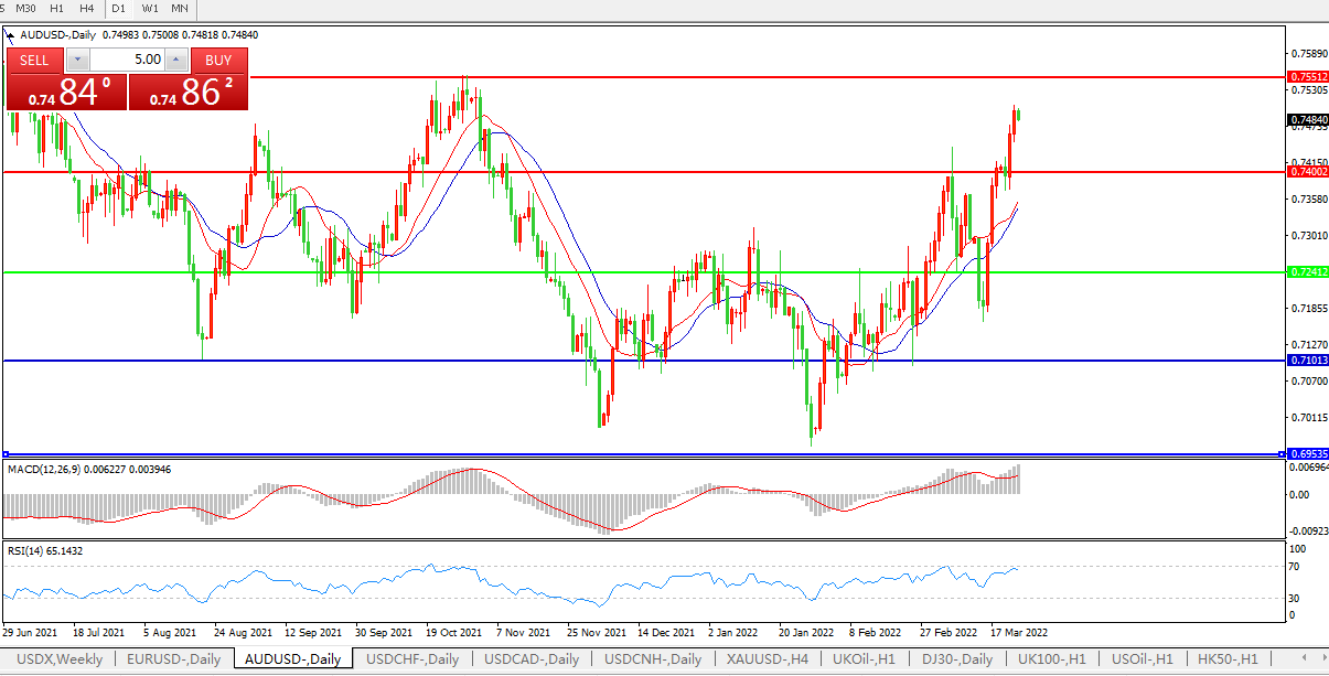 澳元兑美元AUD/USD受惠于美国股市,在过去六个交易日中有五个交易日大幅上涨。西太平洋银行货币策略师Sean Callow表示,市场可能已经看到投机者回补空头仓位,但乌克兰冲突仍在继续,令澳大利亚大部分关键商品出口的价格承压下降。技术上讲,在触及2021年10月的高点0.7556之前,该货币对目前没有遇到重大障碍。但Callow补充称,考虑到能源价格飙升对全球经济增长造成的损害,最近的反弹可能无法持续。