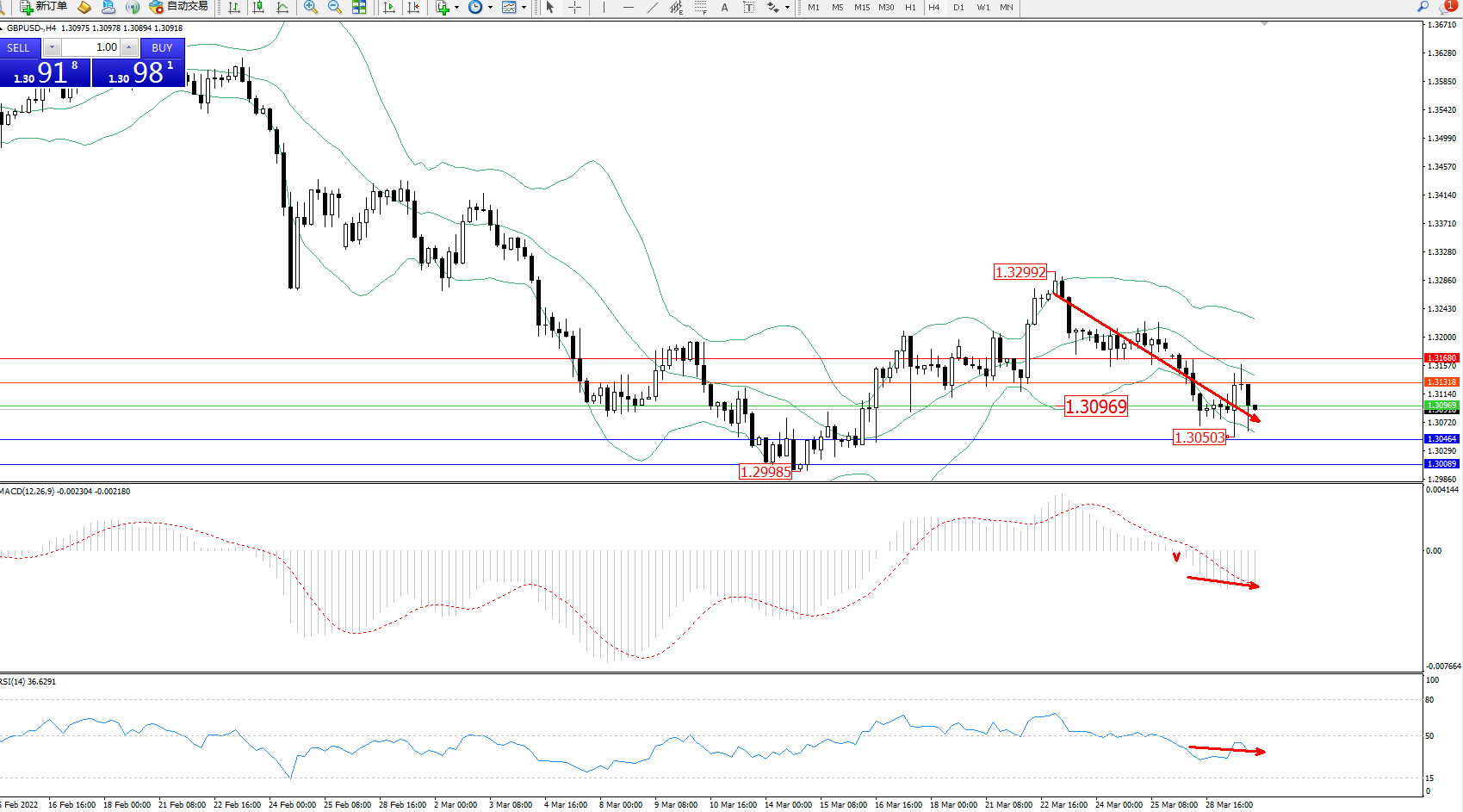 交易策略:1.30969下方看跌,目标1.30464、1.30089