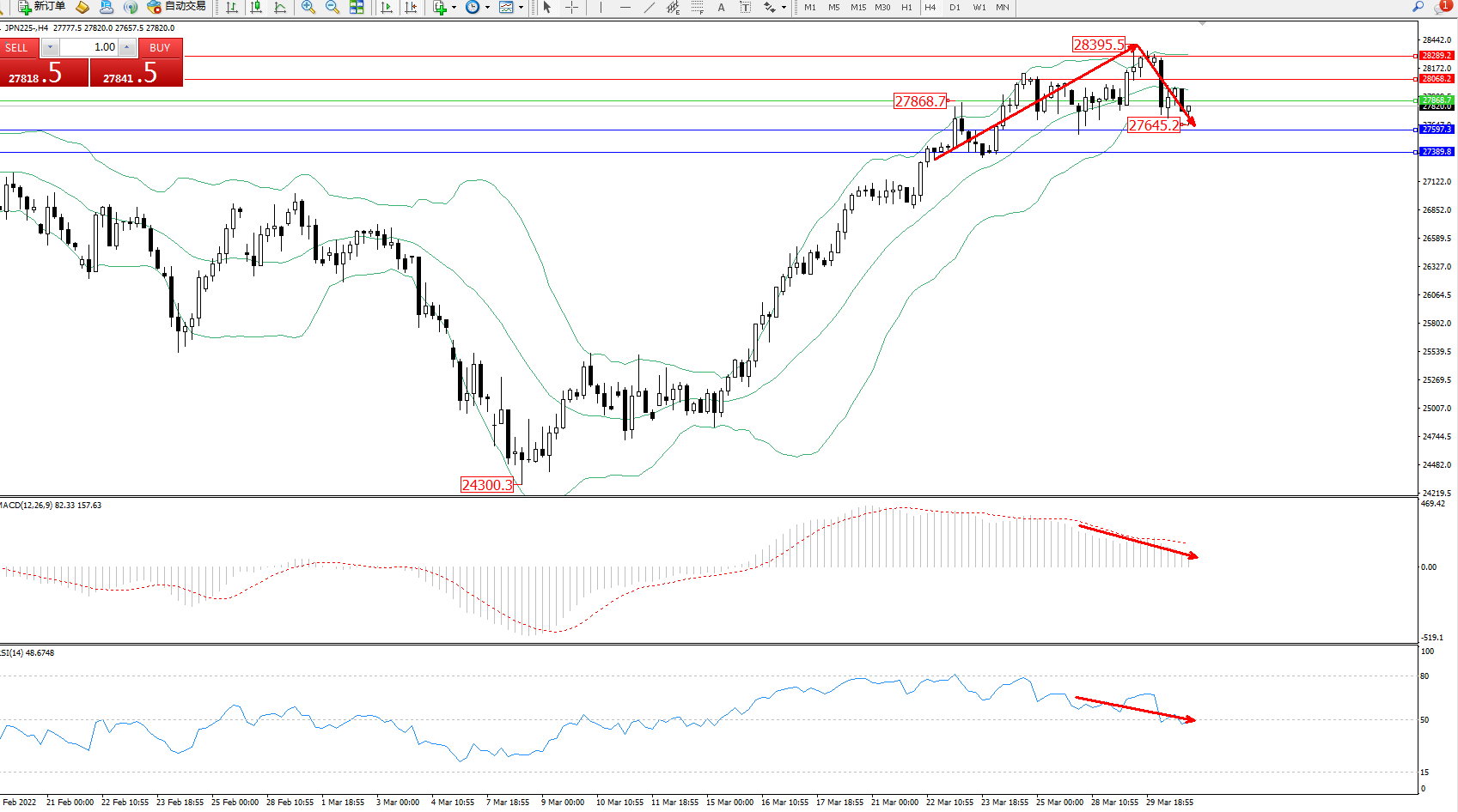 日经指数JPN225——4小时K线图显示: