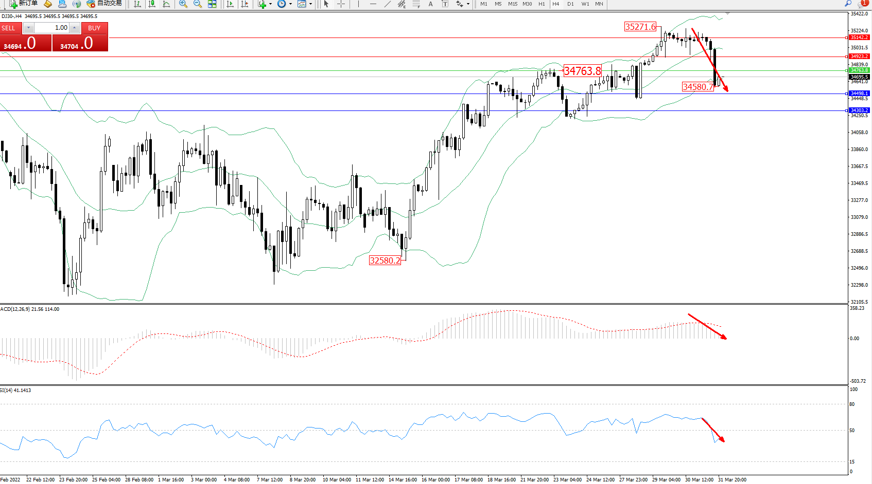 道琼斯指数DJ30——4小时K线图显示:
