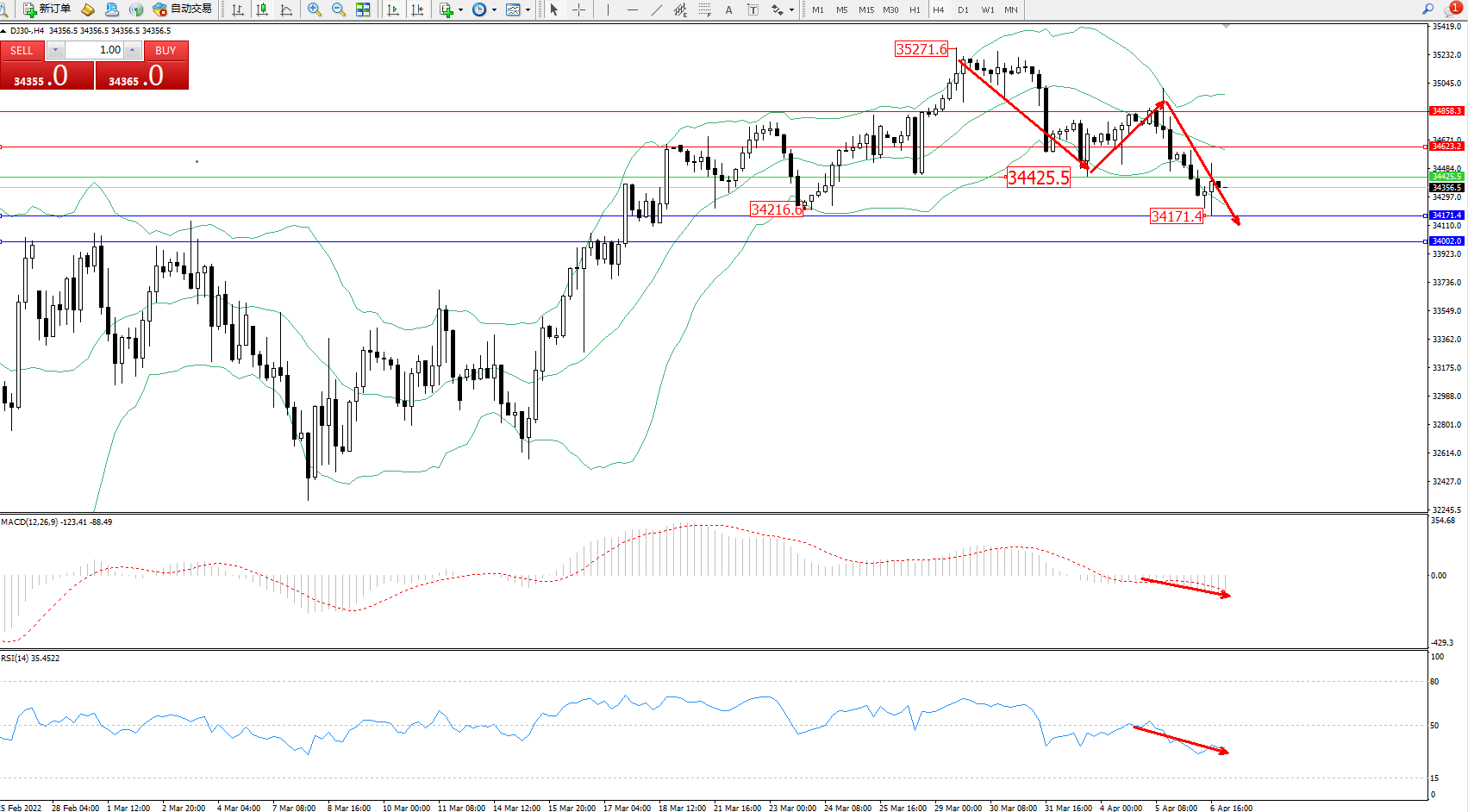 交易策略:34425下方看跌,目标34171、34002