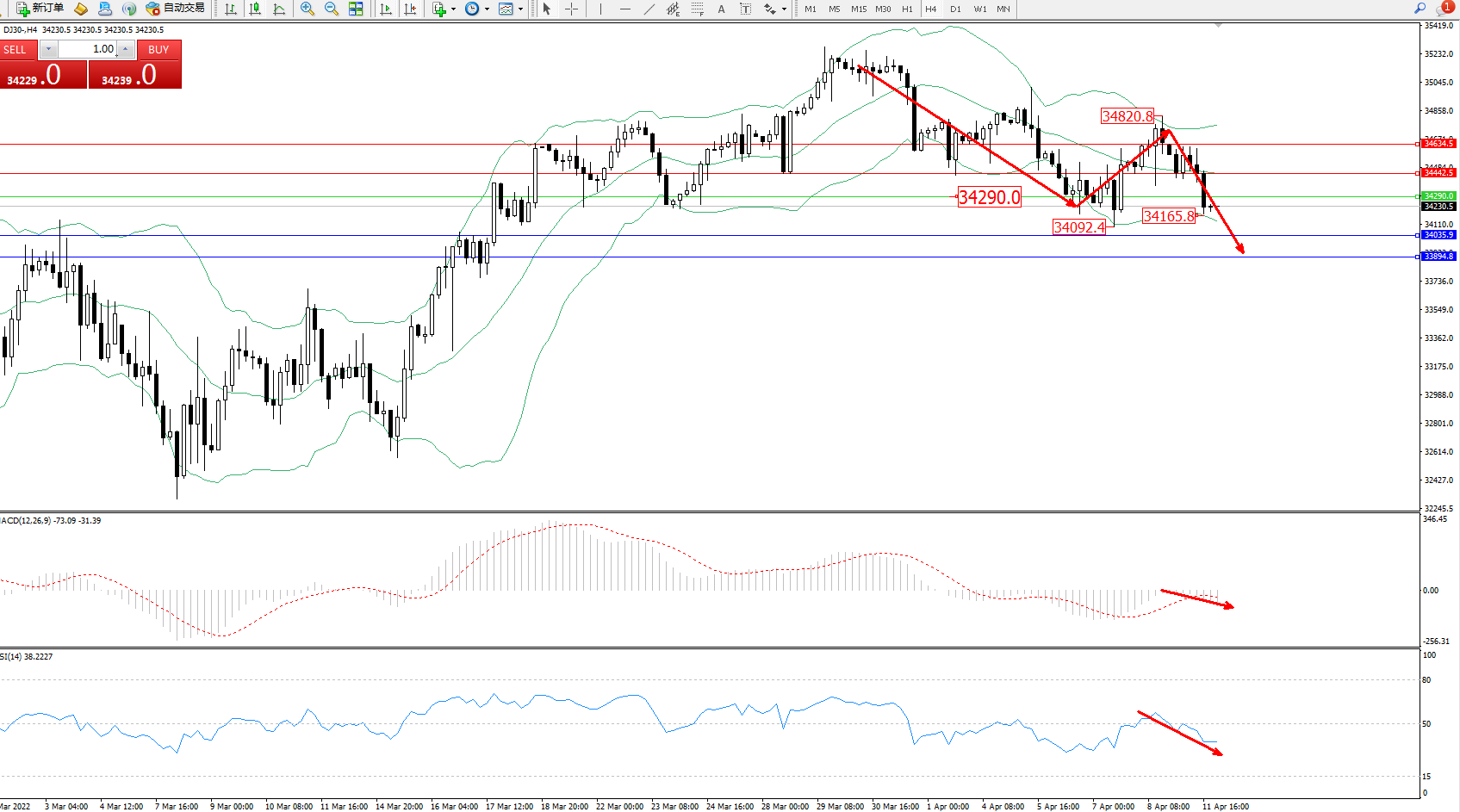 道琼斯指数DJ30——4小时K线图显示: