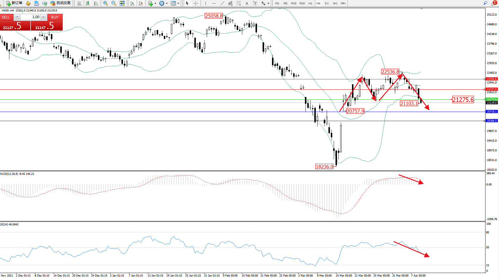 恒指HK50 ——4小时K线图显示: