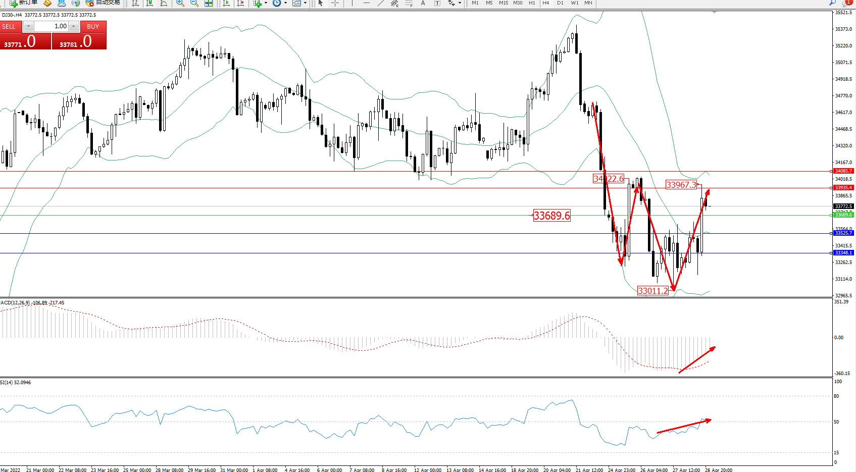 道琼斯指数DJ30——4小时K线图显示: