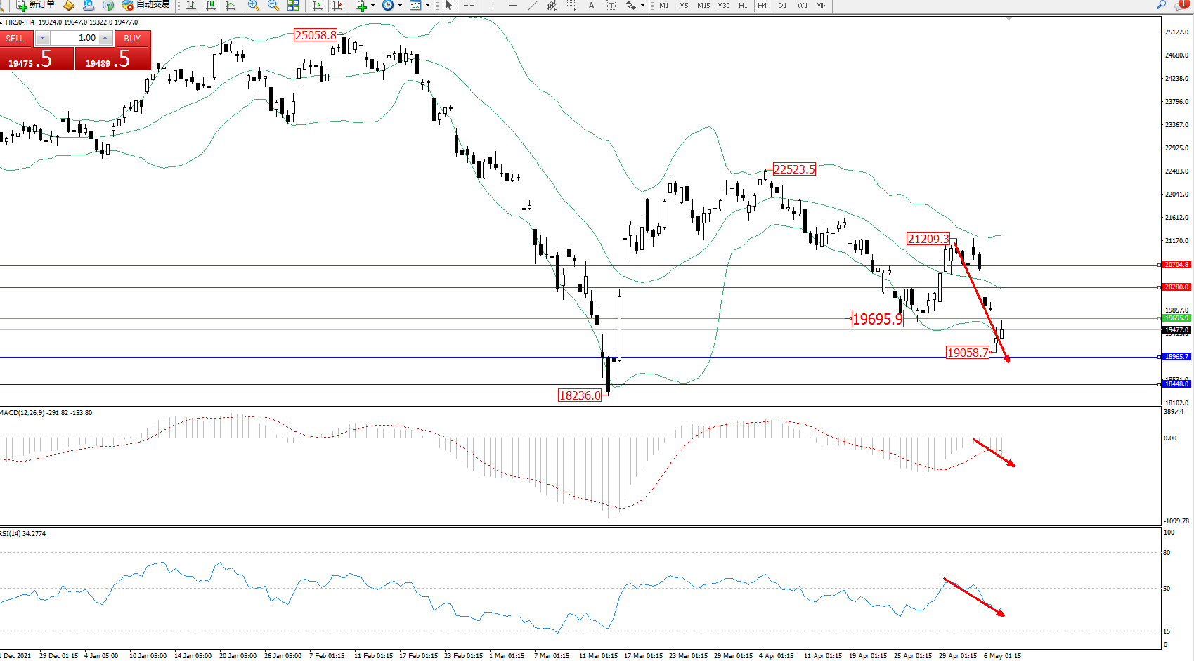 恒指HK50 ——4小时K线图显示: