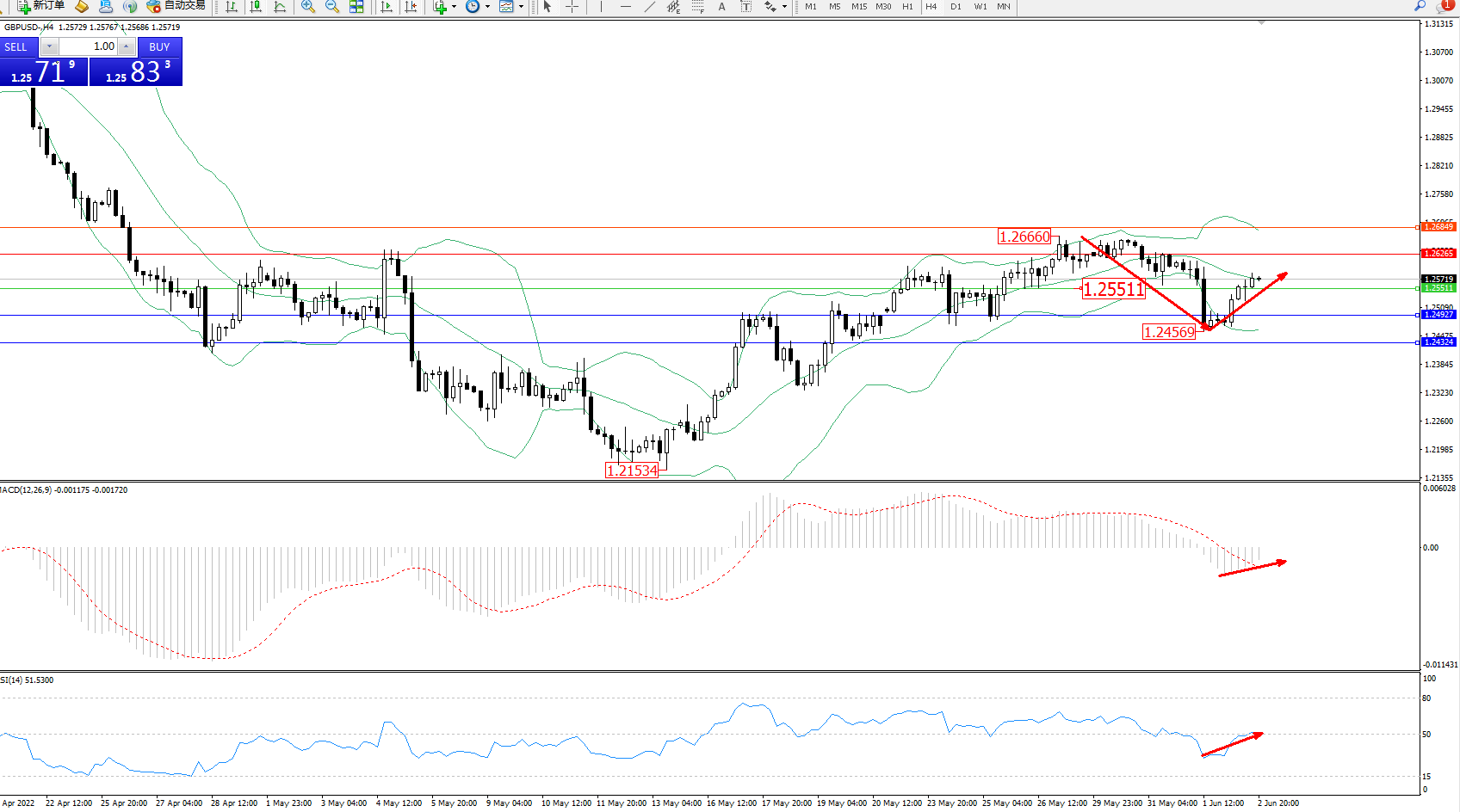 技术点评:高位空头动力维持布林带指标通道中下轨区间持续震荡下行,低位抵达1.24569附近节点后反转上移,触及中轨附近节点整理短期多头动力缓慢震荡上移,布林带指标呈收口走势持续中,MACD指标处于0轴线下方空头区域维持整理,RSI指标处于空头区域维持震荡上移至50均衡线附近徘徊中;