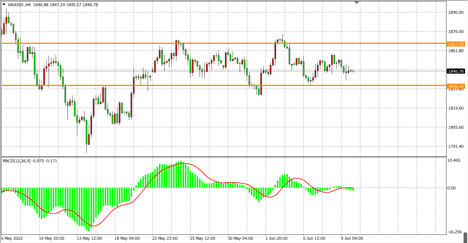 4小时图看,现货黄金在依旧围绕着1850进行来回震荡,在1836-1867的箱体区间未破前,黄金趋势难以确认,操作依旧是以震荡思路看待,高空低多为主。若上方突破1867,有望上看至1880-1890附近;下方跌穿1836,则下看1820-1800附近