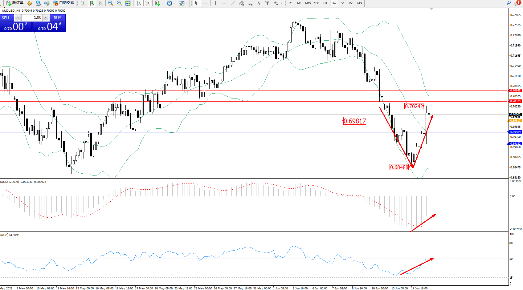备选策略:在0.69817上方看涨,目标0.70375、0.70685