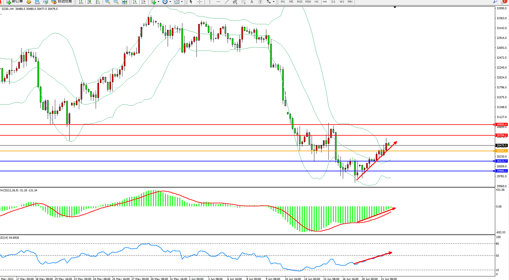 道琼斯指数DJ30——4小时K线图显示: