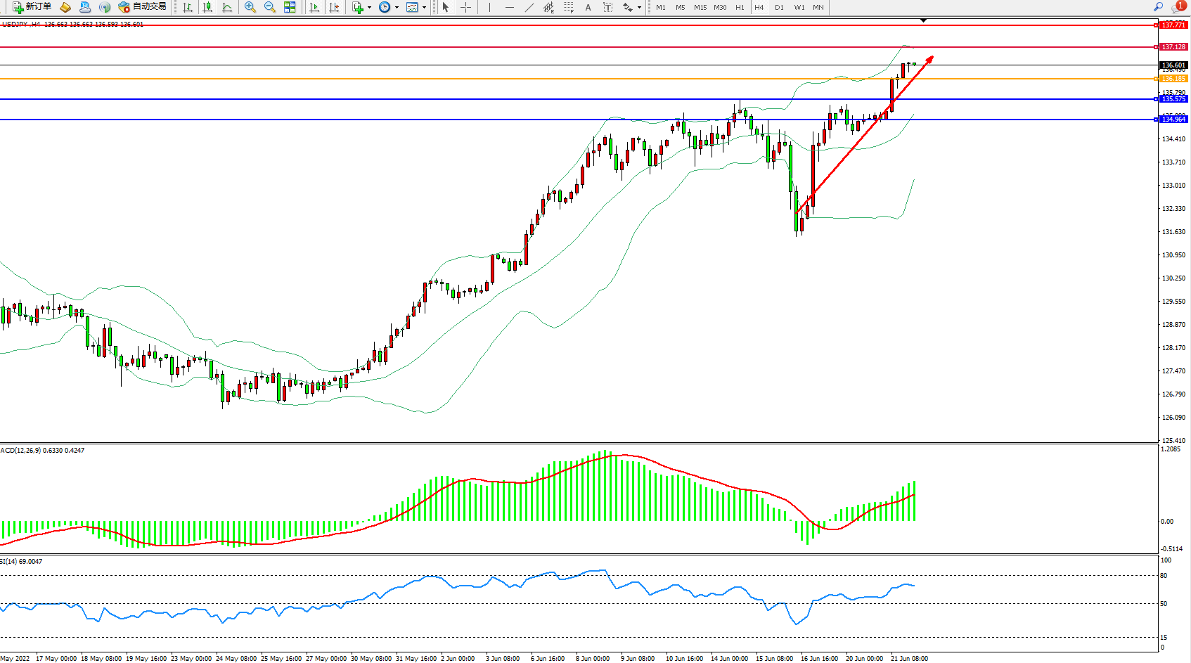 交易策略:136.185上方看涨,目标137.128、137.771