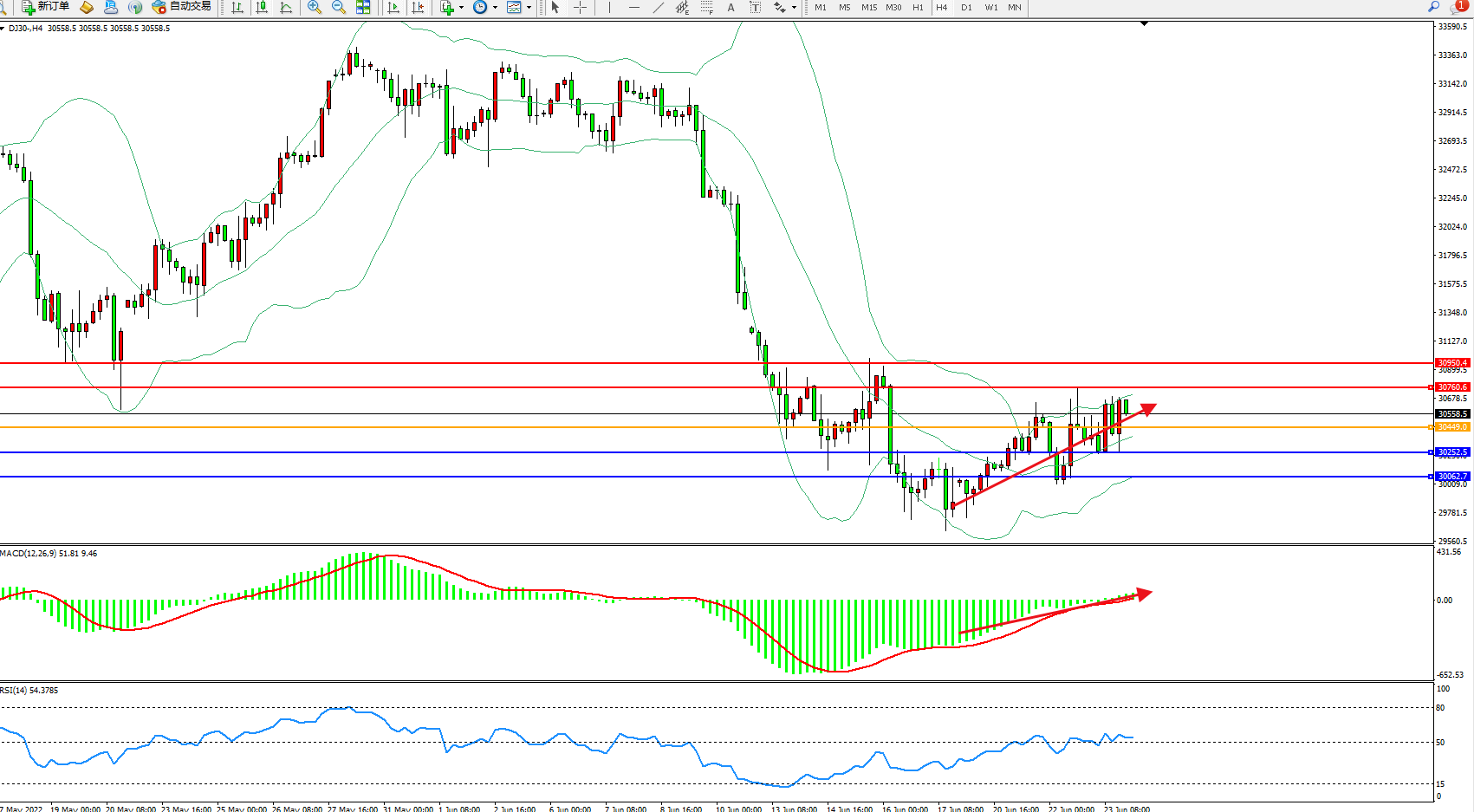 道琼斯指数DJ30——4小时K线图显示: