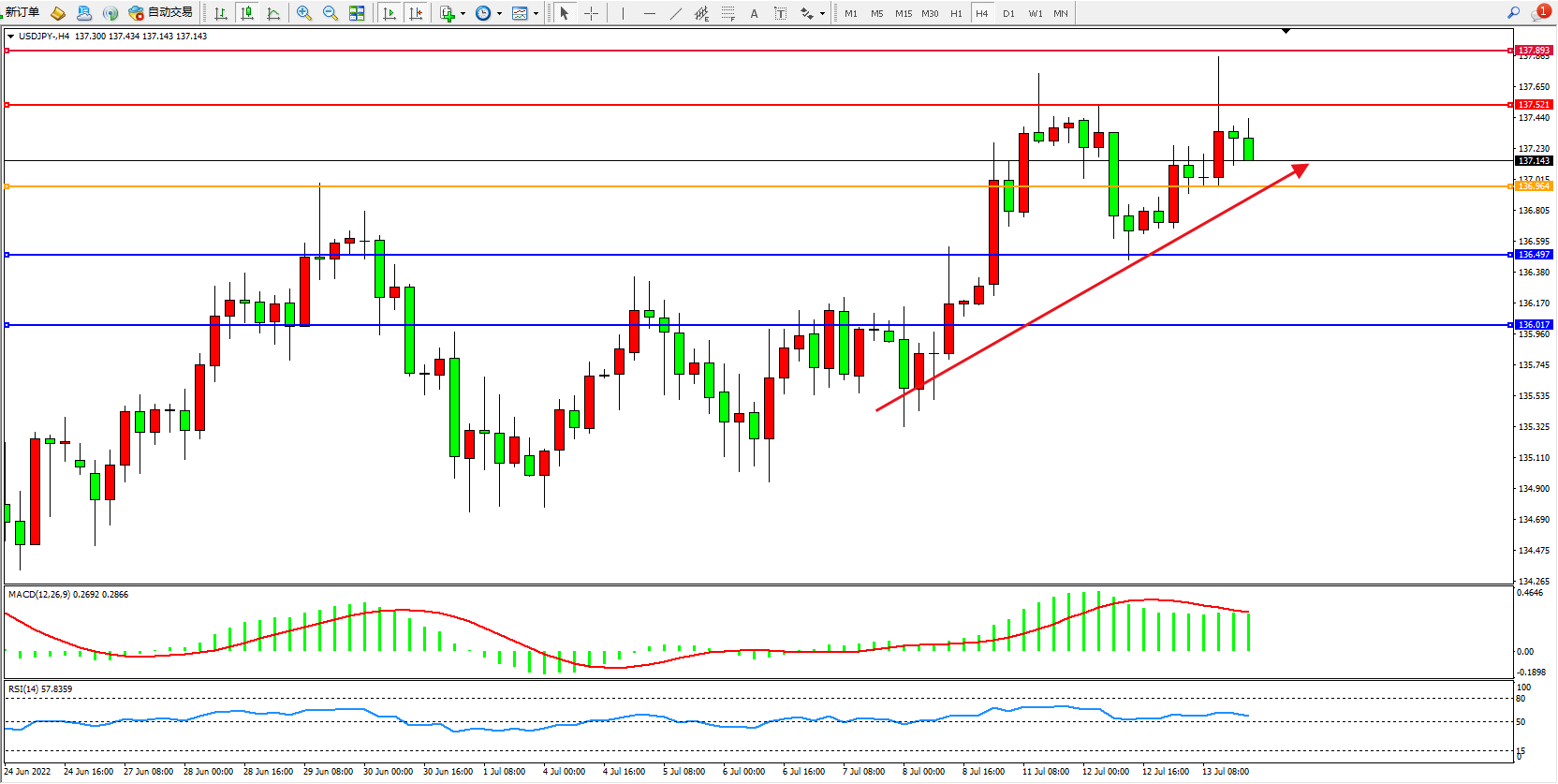交易策略:136.954上方看涨,目标137.521、137.893