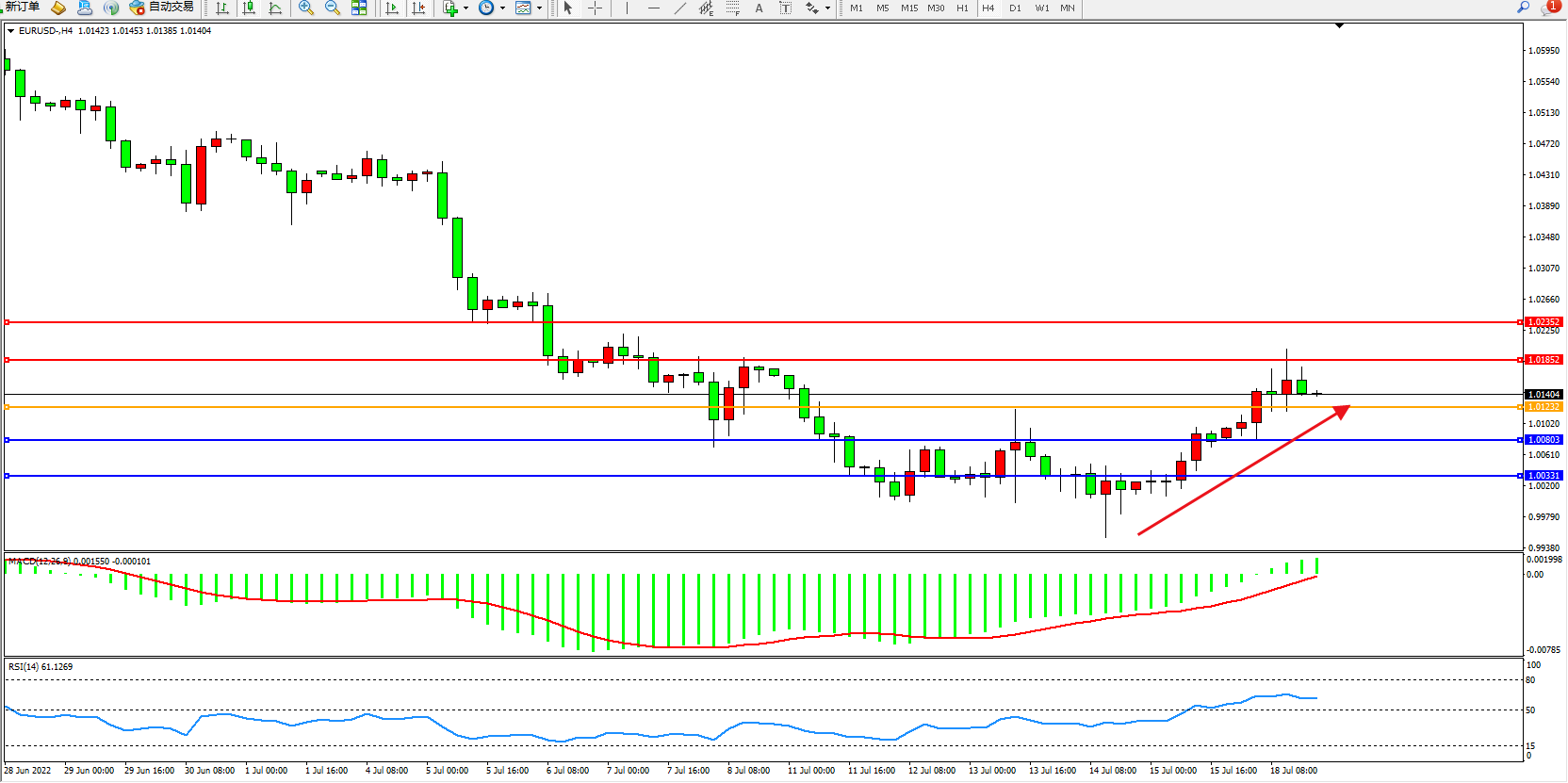 欧元美元EURUSD—4小时K线图显示: