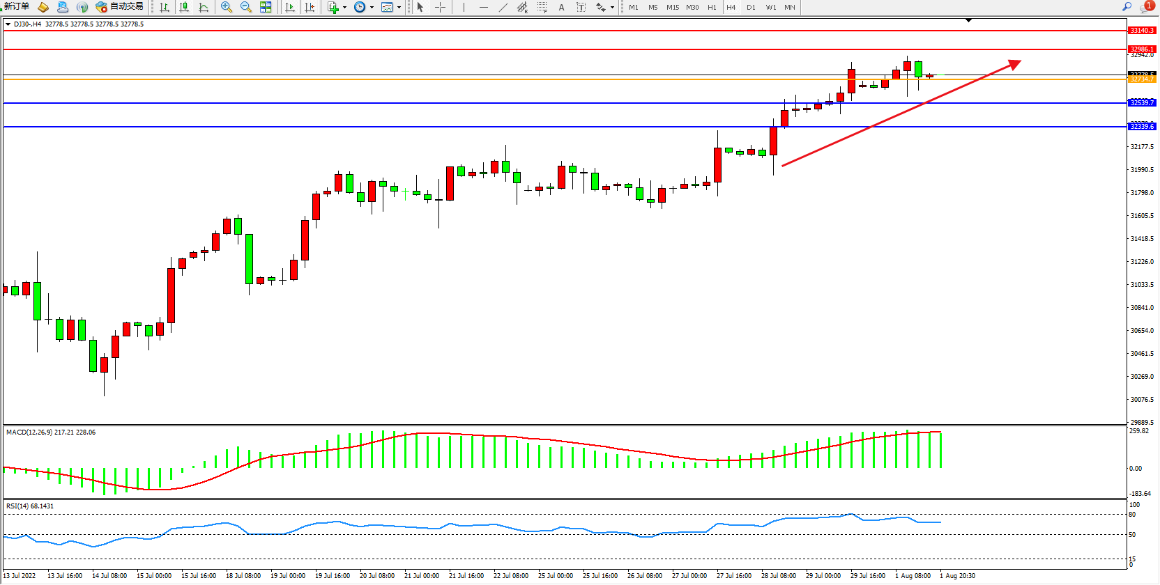 道琼斯指数DJ30——4小时K线图显示: