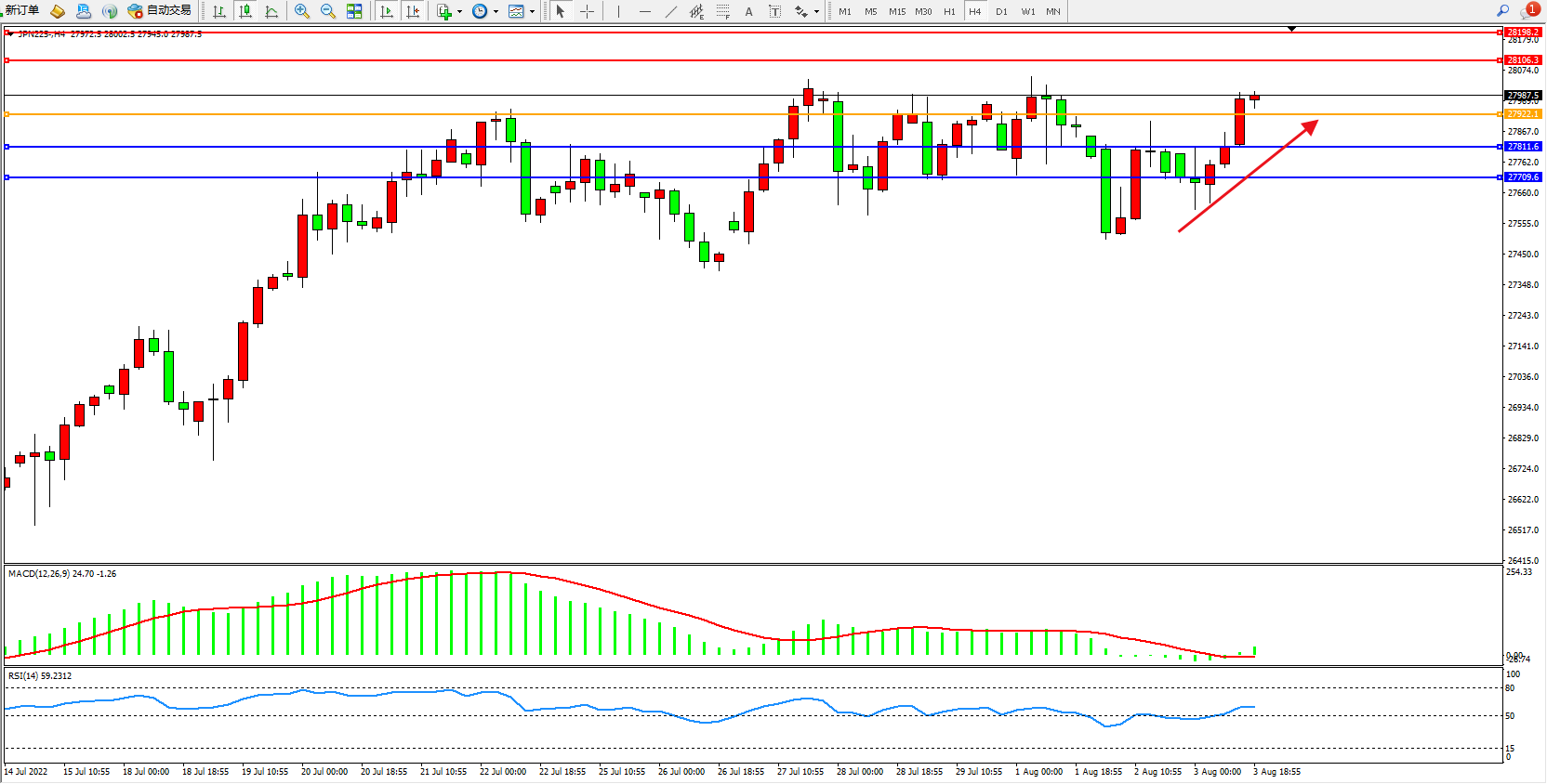日经指数JPN225——4小时K线图显示: