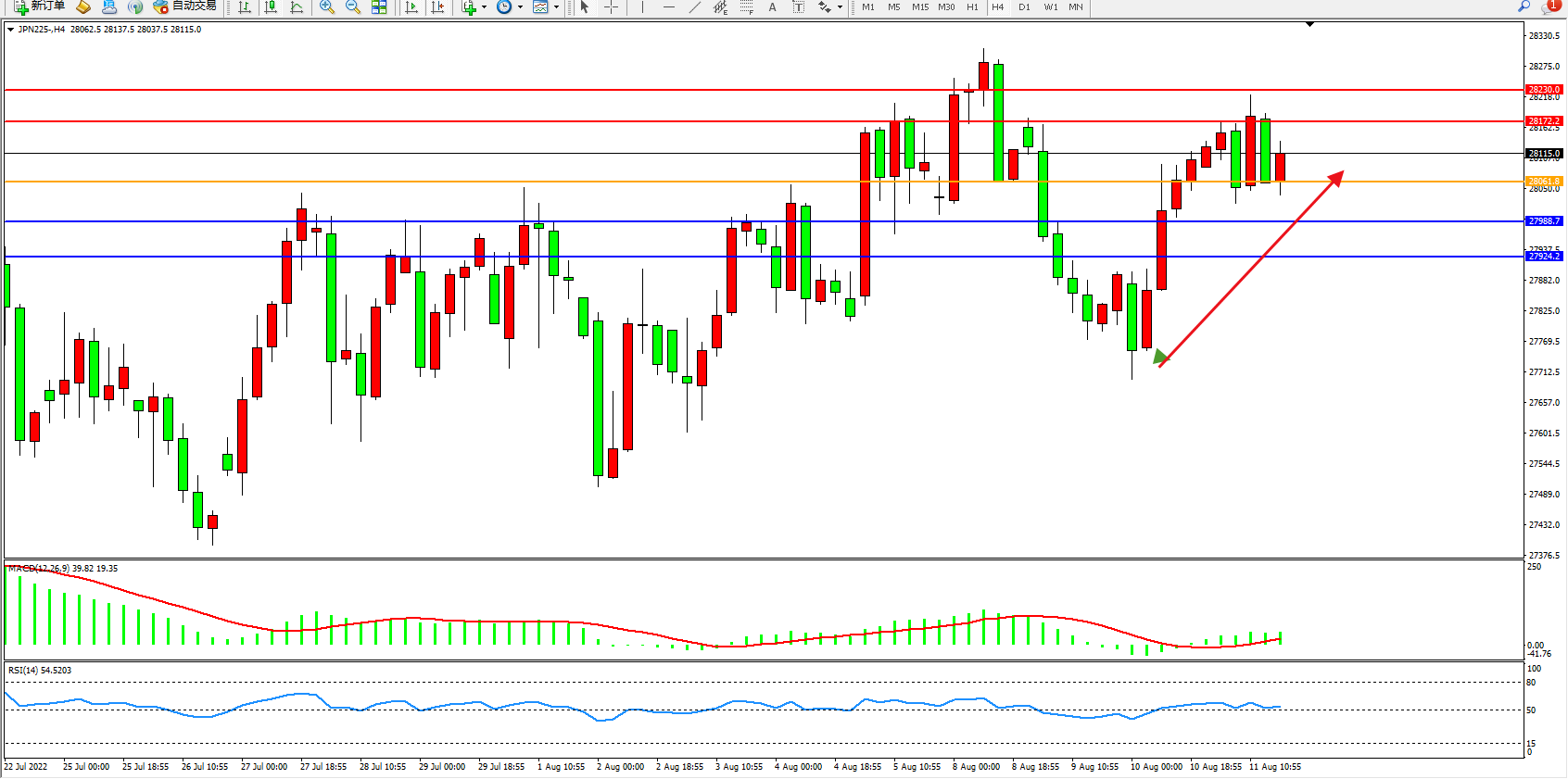日经指数JPN225——4小时K线图显示: