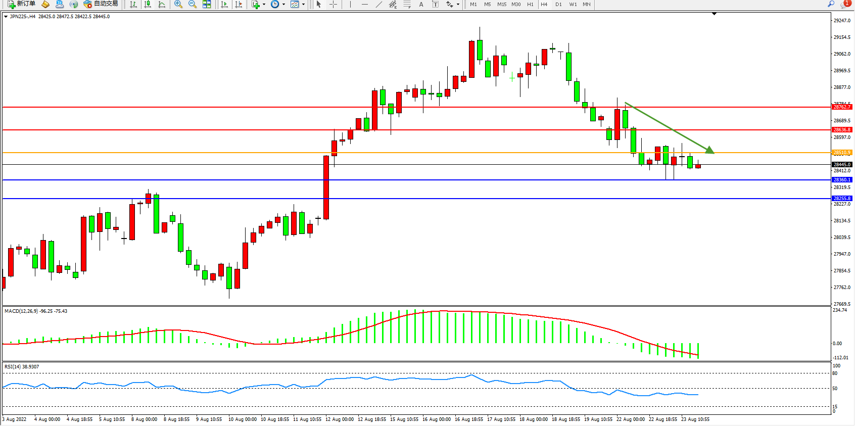 日经指数JPN225——4小时K线图显示: