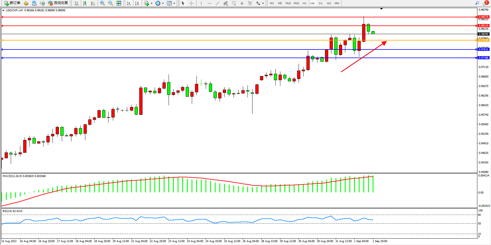 美元瑞郎USDCHF——4小时K线图显示: