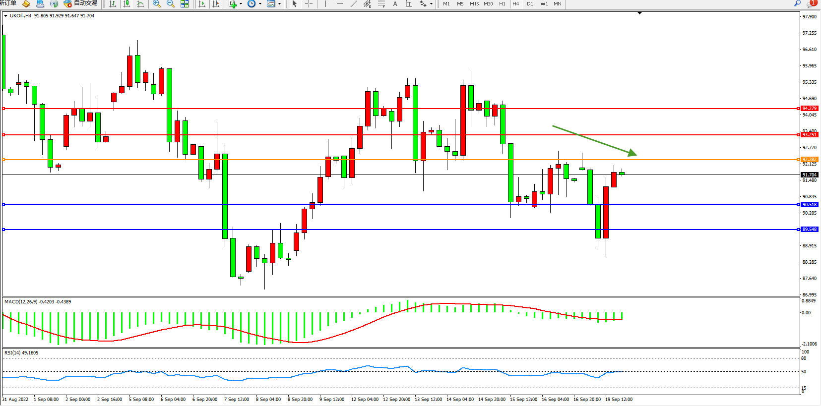交易策略:92.282下方看跌,目标90.518、89.548