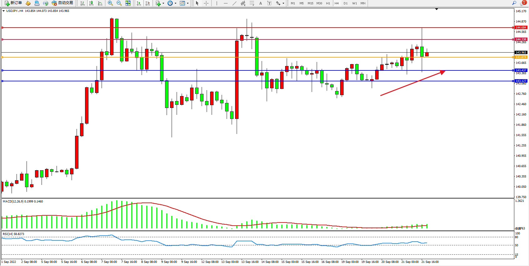 备选策略:143.819下方看跌,目标143.437、143.127