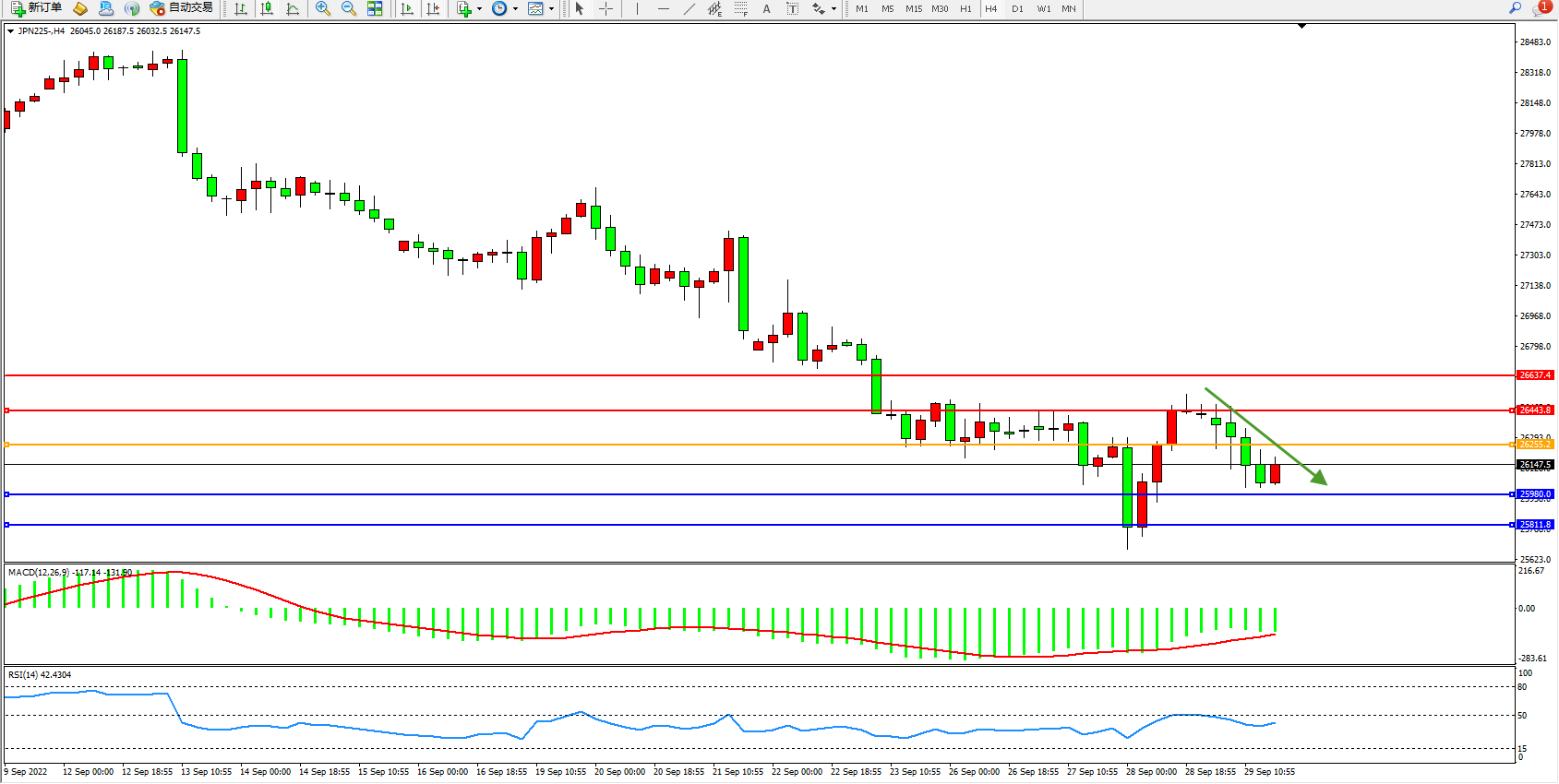 日经指数JPN225——4小时K线图显示: