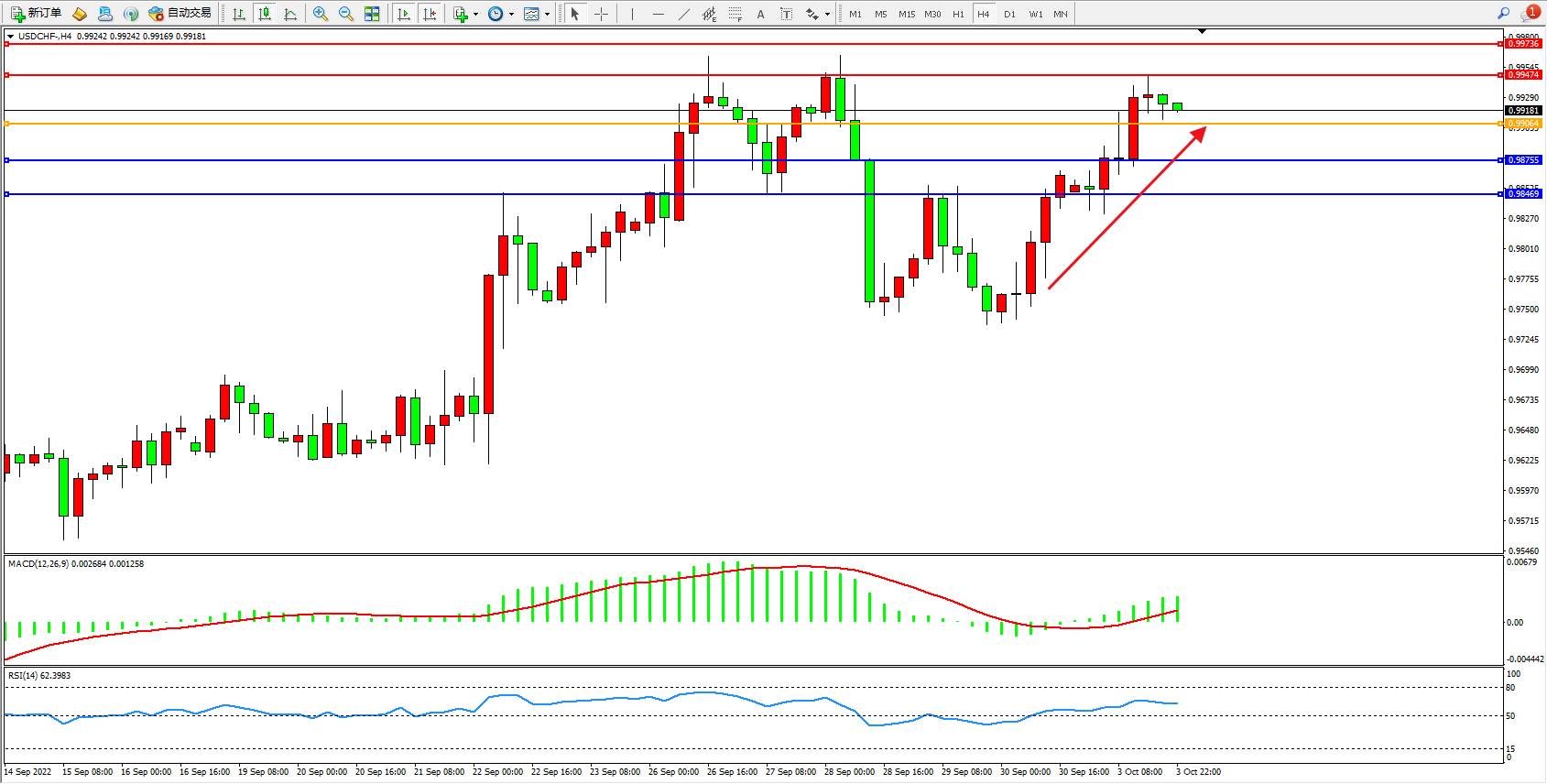 美元瑞郎USDCHF——4小时K线图显示: