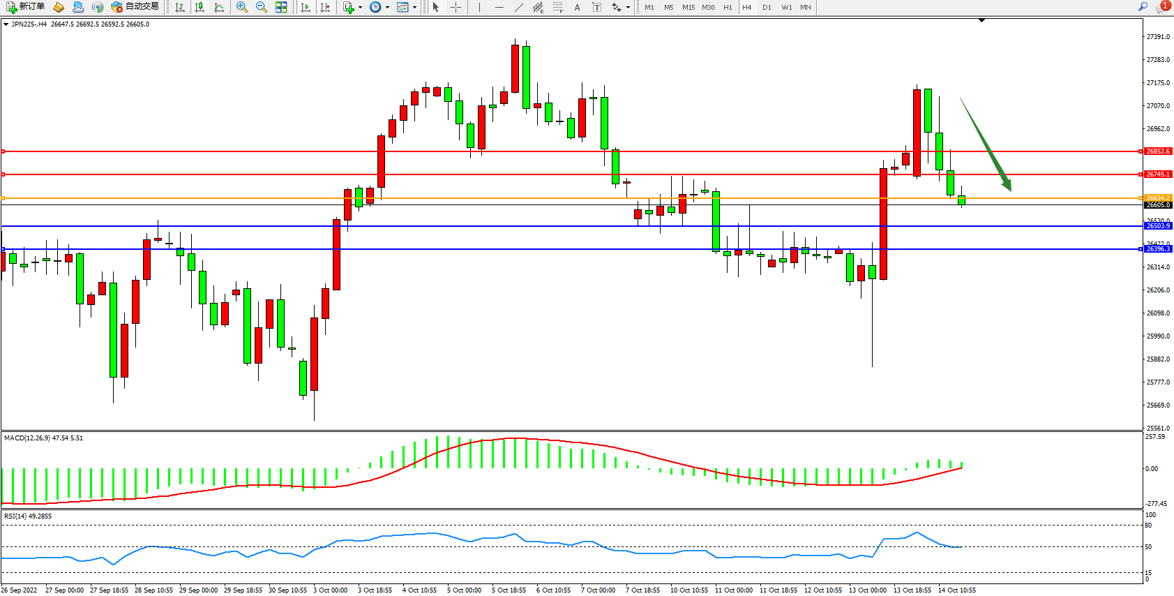 日经指数JPN225——4小时K线图显示: