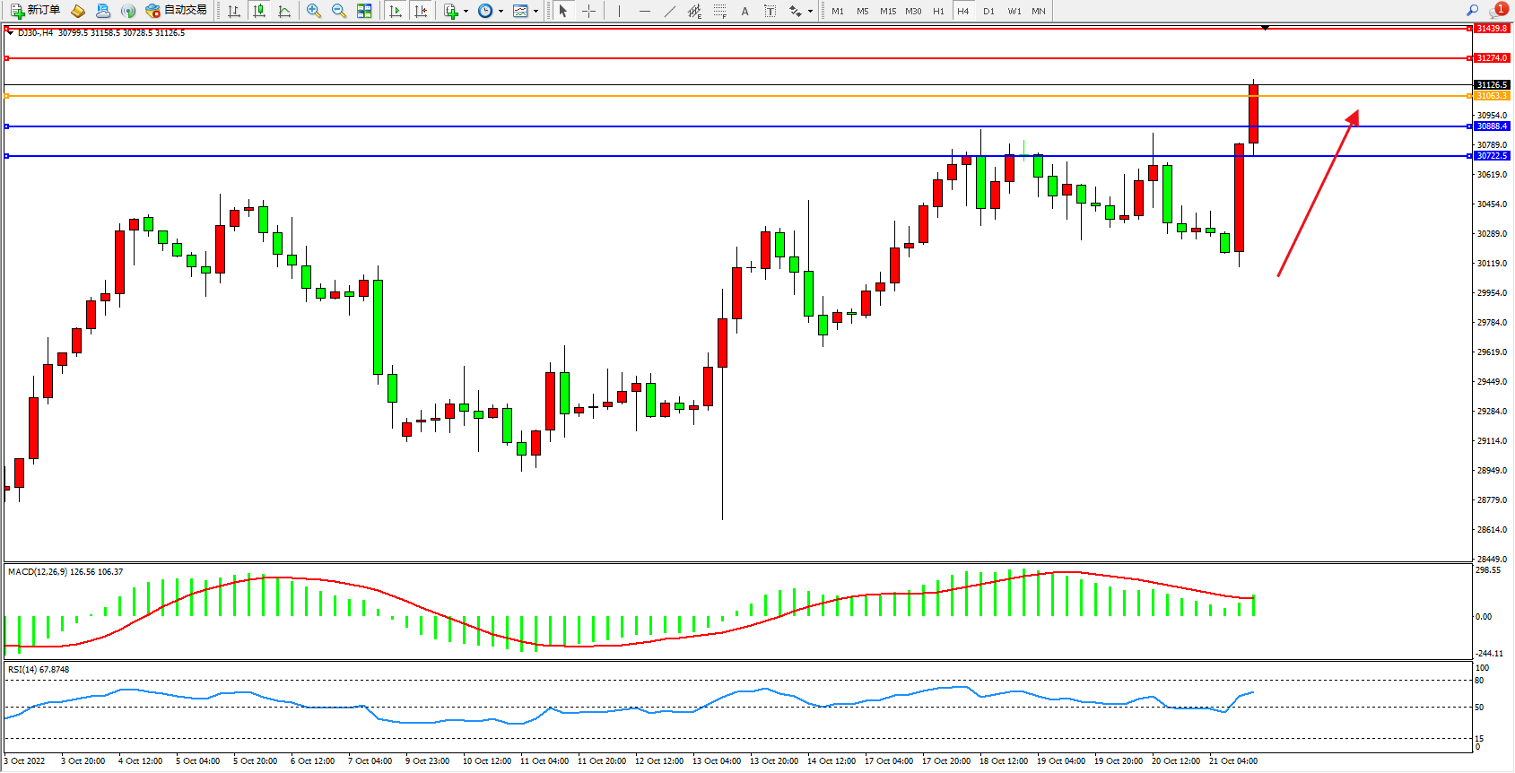 道琼斯指数DJ30——4小时K线图显示: