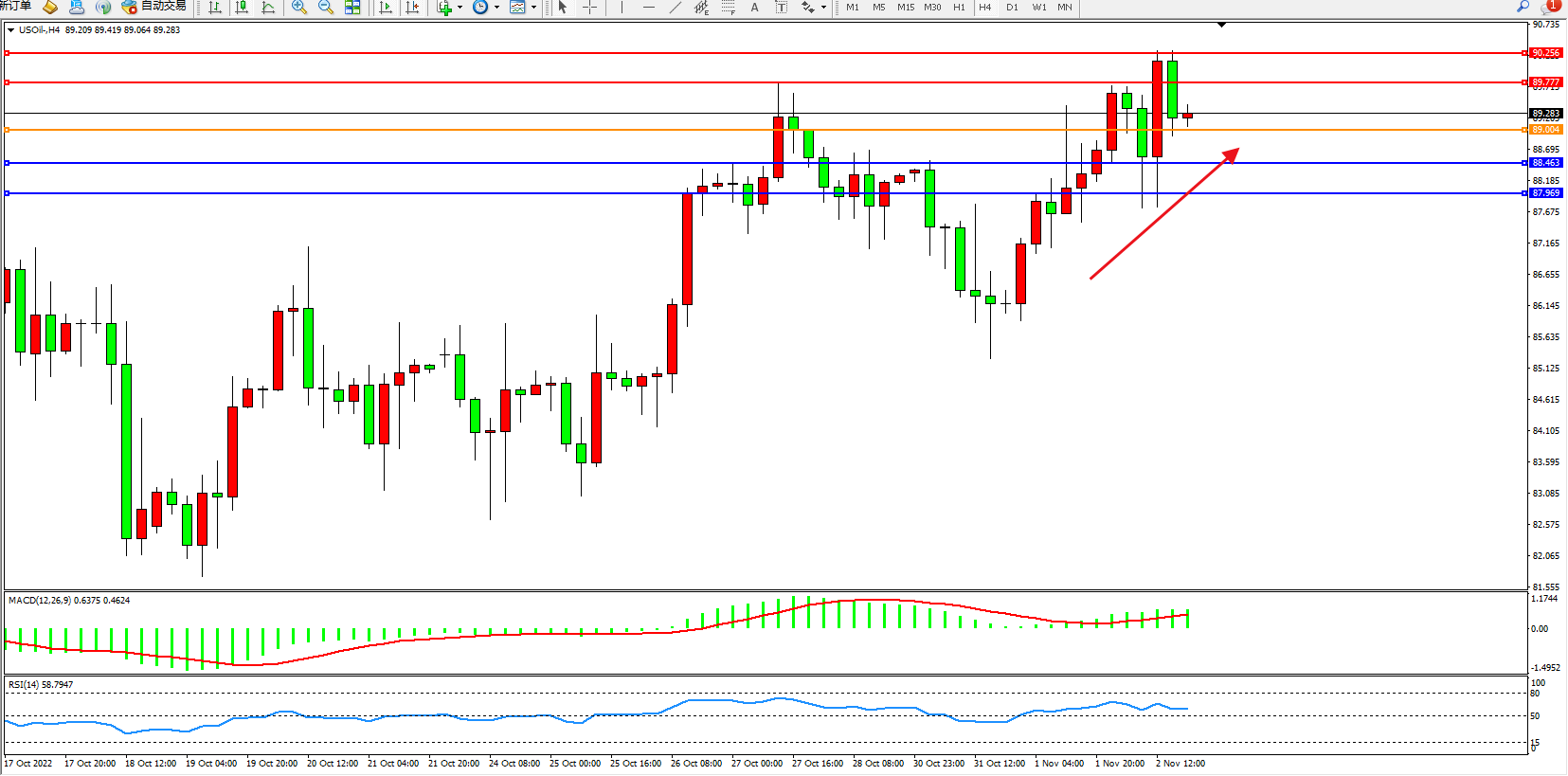 原油维持89.283附近震荡,美国EIA公布的数据显示,截至10月28日当周美国除却战略储备的商业原油库存降幅超预期,但降幅不及API降幅。