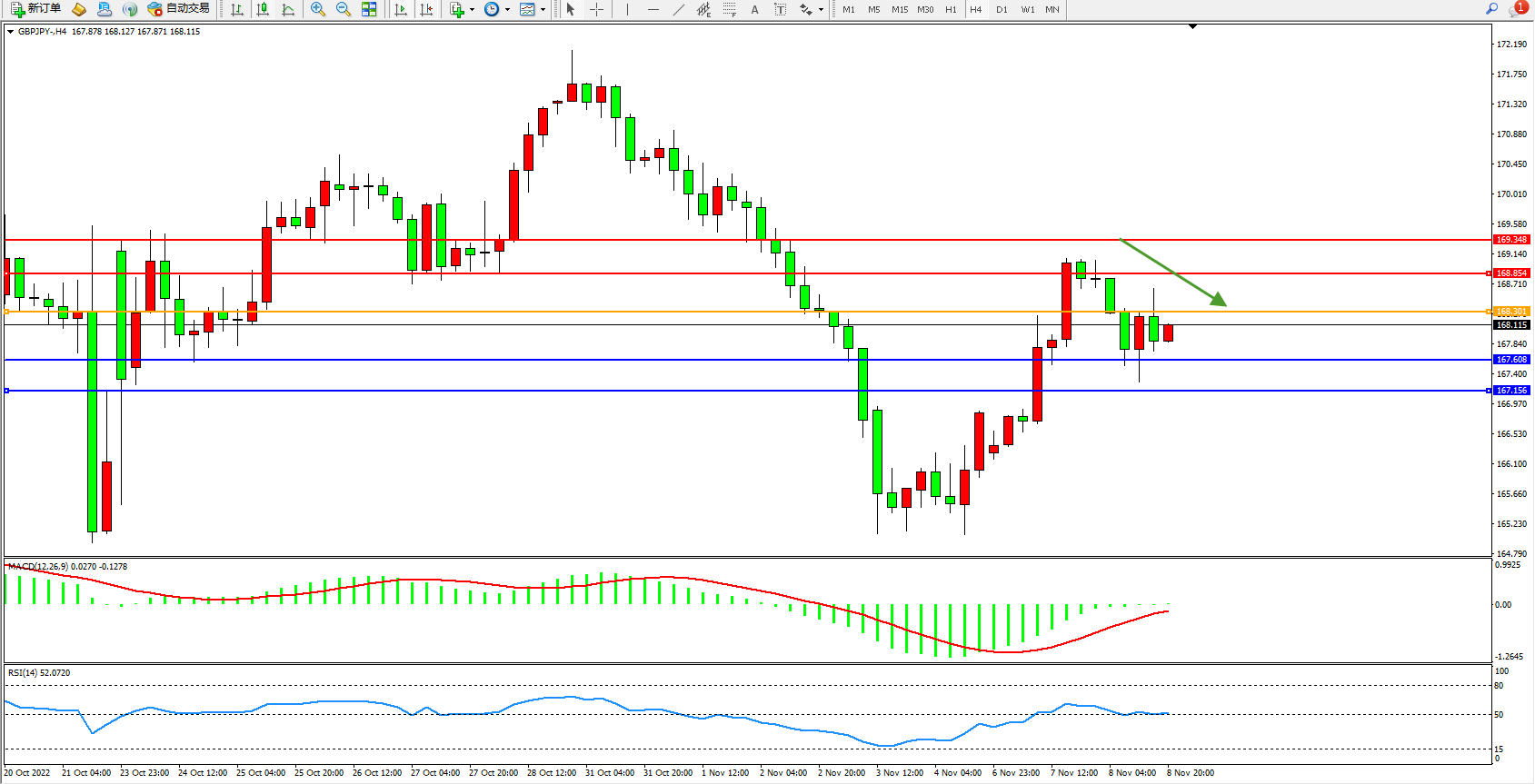 交易策略:168.301下方看跌,目标167.608、167.156