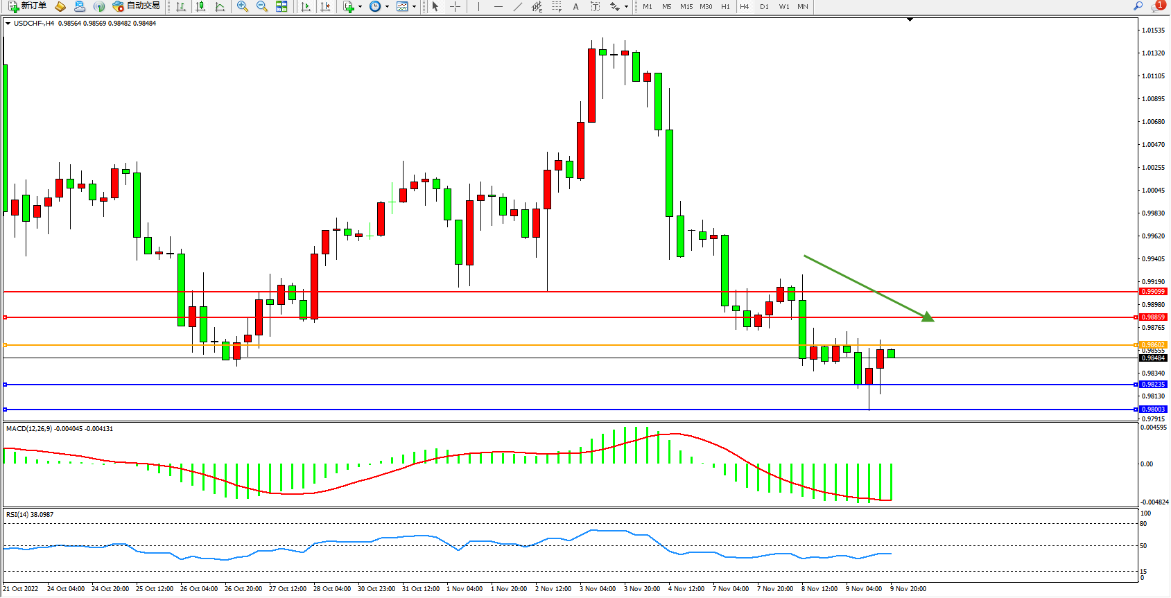 交易策略:0.98602下方看跌,目标0.98235、0.98003