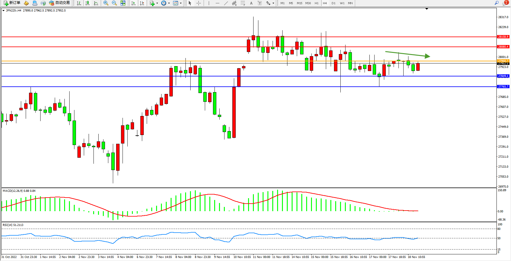 日经指数JPN225——4小时K线图显示: