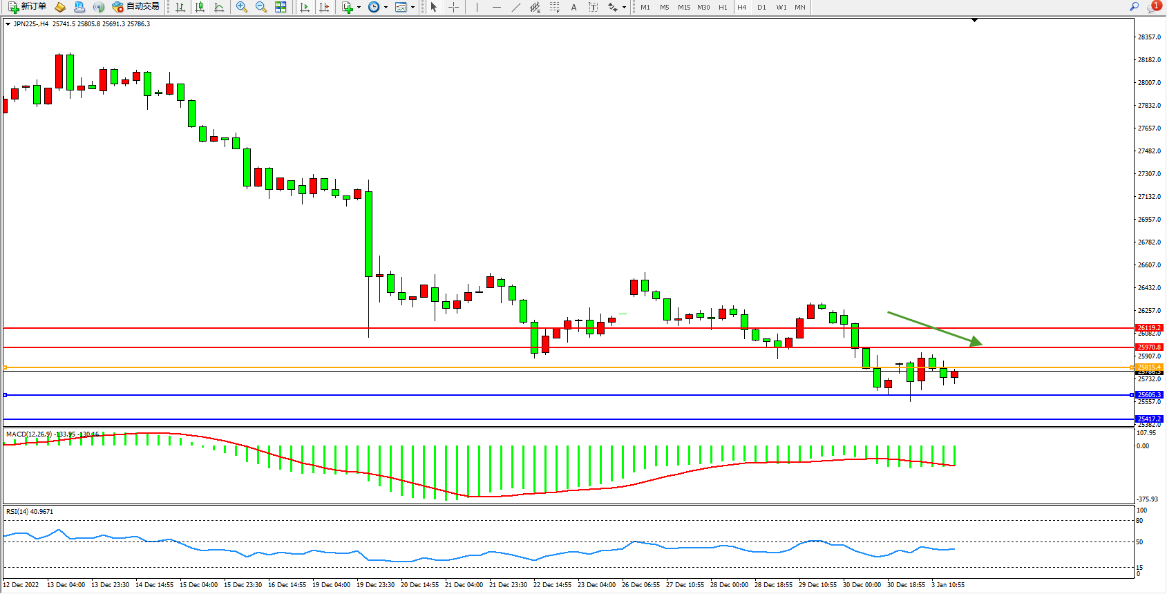 日经指数JPN225——4小时K线图显示: