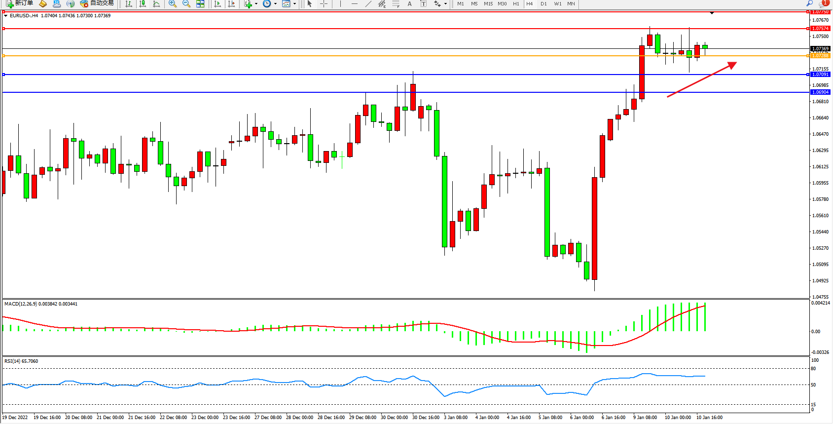 欧元美元EURUSD—4小时K线图显示: