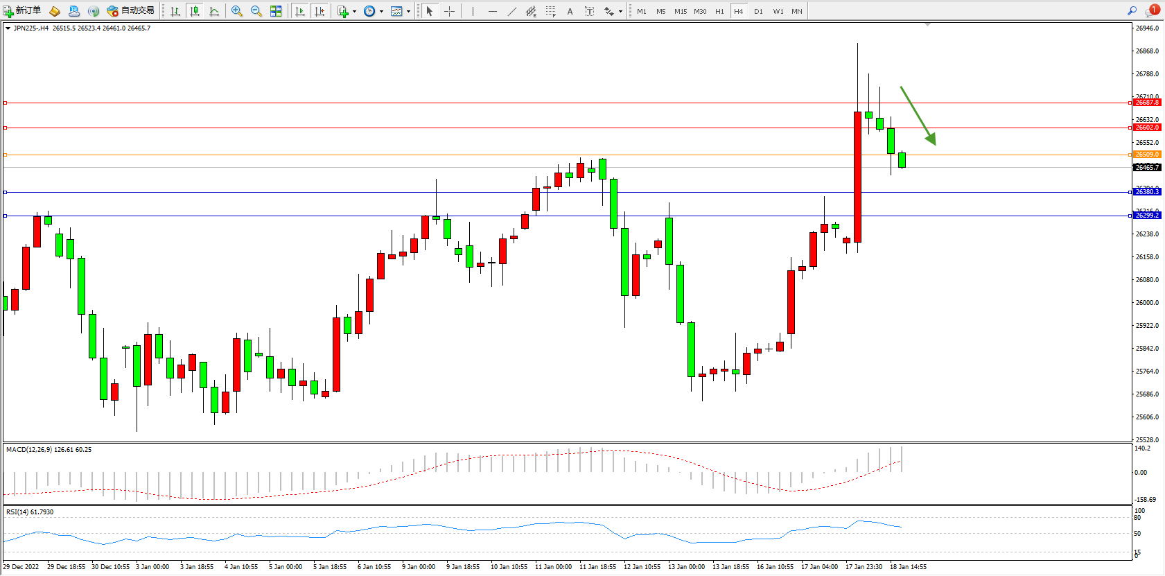 日经指数JPN225——4小时K线图显示: