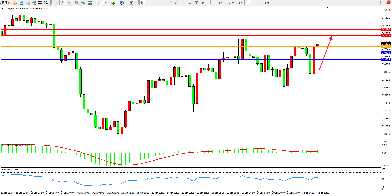 道琼斯指数DJ30——4小时K线图显示: